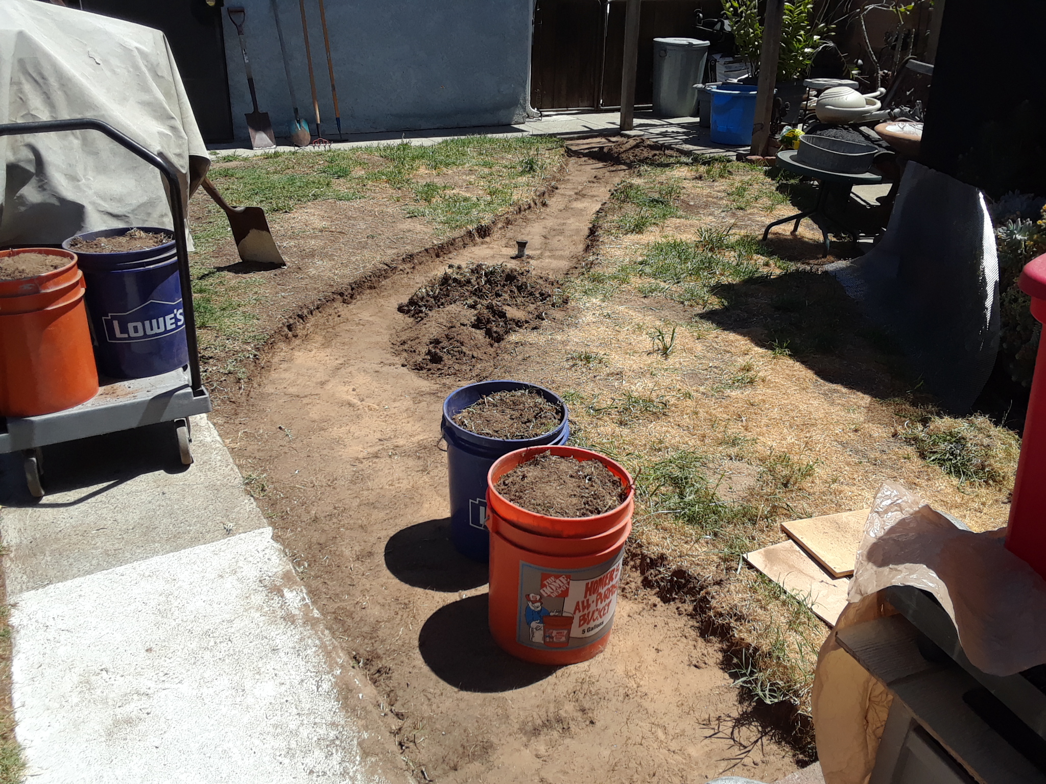 I took off time from the '914' transport vehicle (aka: trailer/conversion) project to start digging the perimeter outline for additional parking/work space in the back yard (the area in the left side of pic will get paved).