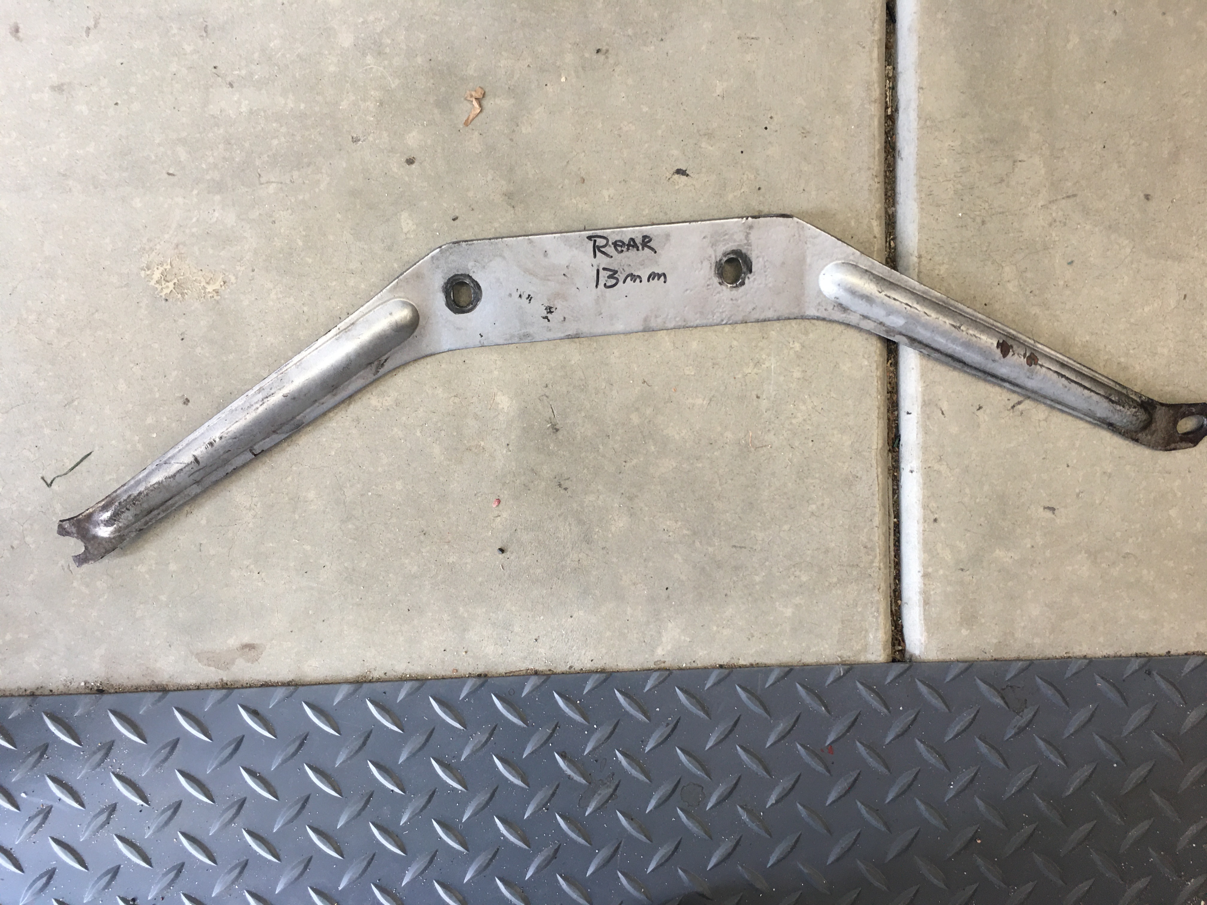 The muffler hanger end was broken, Keith fabricated a new end from a shelf bracket