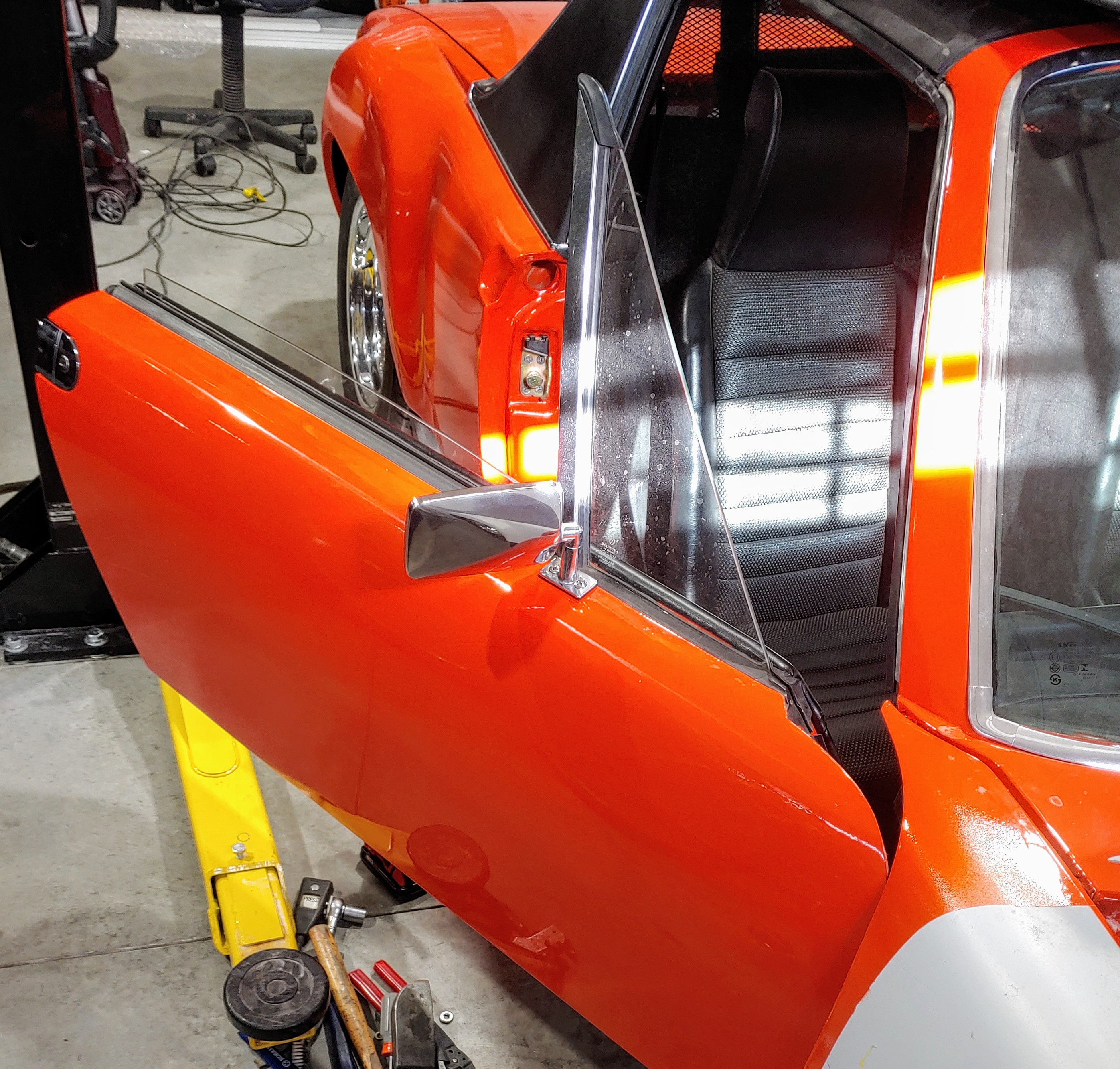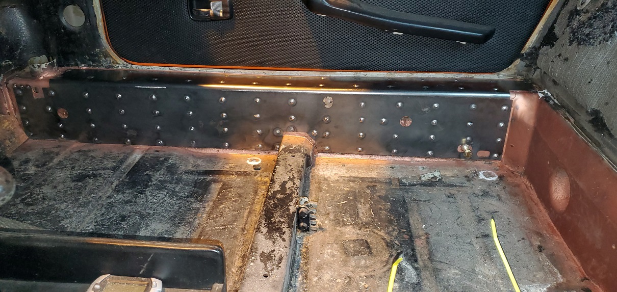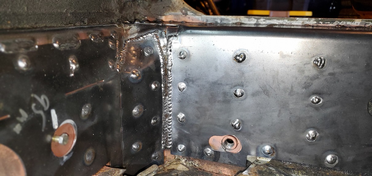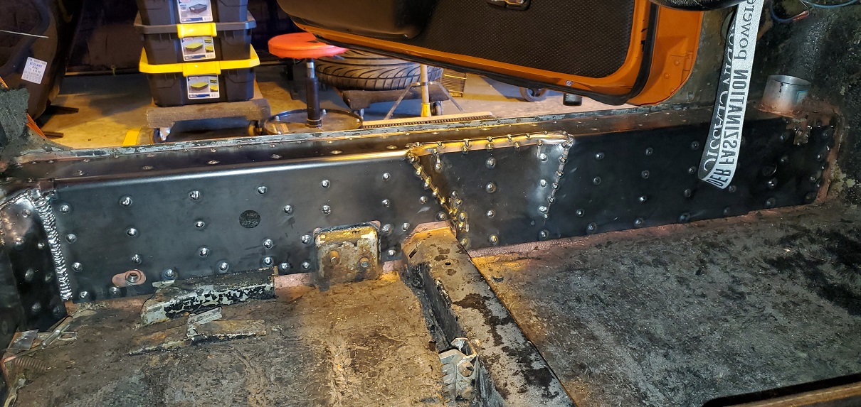 But the last couple days where spent putting an inner stiffening kit in Matt's V8 car. While Your In Their Stuff, cars going in to get the trunk painted. Their is a little tuning needed if its going in a street car. Both the seat belt and back pad holes need to be enlarged. Seat belt, up and down. Back pad, side to side. Next week, GT kit from Mad Dog. MillerMatic 140 with .023 wire on Autoset. Someday I'll get a flatter puddle. (IMG:style_emoticons/default/dry.gif) I hope they never wreck this car. It's going to take the Jaws of Life to cut it apart. I believe what your seeing on the floor pan in sprayed on Lizard Skin. |
