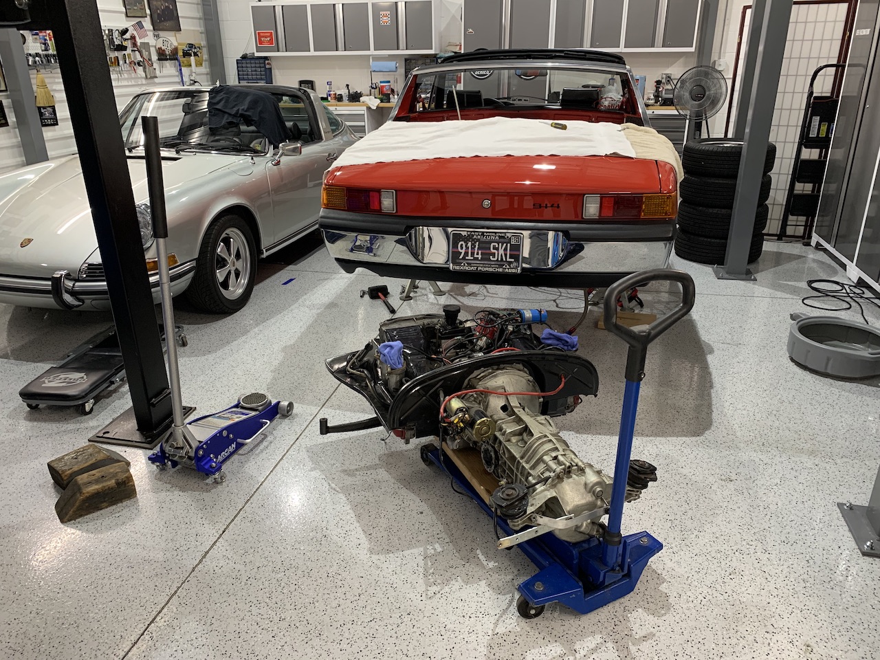Dropped it today with the great help of Rickb45 who is my close-by resident friend who is an 914 expert on so many things. Few hangups on right carb where fuel line attaches and a couple other glitches, but overall went well. With car on my 10k lb. lift, we dropped engine onto 4x12's on a motorcycle lift table which gives me multiple great heights to work on engine. Long list of TTD's (Things to Do): new alternator (harness looks great, like rest of car - as you'd expect for a car with only 60k miles ), install cooling vanes a former PO had removed, install new T'stat from AwesomePowderCoating, remove, clean & repaint tins, completely & thoroughly clean both engine & transmission, clean & repaint engine bay - and whatever else shows up as needing to be done. Here's a pic of Rick at the end of the job - a huge public thanks for all the help! PS: note how clean and rust free the pan is...incredible......as Rick keeps telling me, this is a gem of a car in amazing condition in every way...... GN (IMG:http://www.914world.com/bbs2/uploads_offsite/i890.photobucket.com-21449-1588814407.1.jpg) |