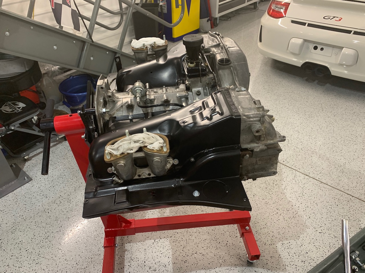 Pushed the engine-less car out into the driveway and scrubbed out as much dirt as possible from the engine compartment, under the rear trunk and in the gas tank area. Not very exciting work (but very soggy), so I didn't bother taking pics.