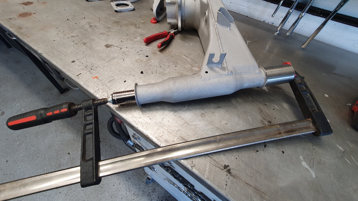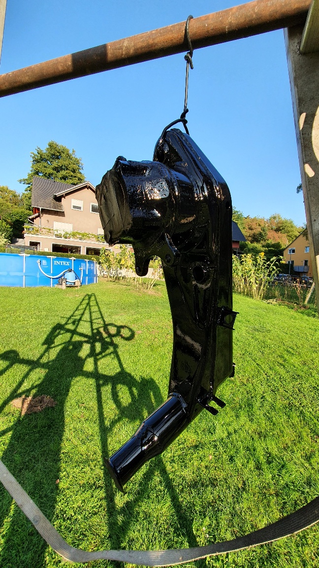 Swing arms back from the blaster today along with other project parts. Cleaned up all the factory weld splatters and then welded some re-enforcment beads. Then off to my "nature" paint booth with some 2K eBay 2K paint. A good day......