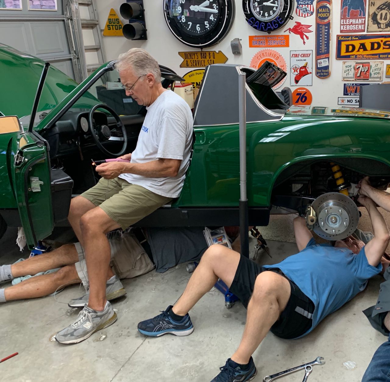 My brother and I drive down to Fullerton on Friday and Jeff at Aase did a valve adjustment and of course an oil/filter since it was already up in the air. He also replaced my oil temperature sender as the one in my car was for an SC. Now my oil temperature is reading spot-on. As expected, with a little over 1K miles on the car, we had some loose valves. 4 exhaust were at 6 and 5 intakes were at 6. Now they are all back to 4 and the engine is running and sound great. Thanks Jeff. Then on Saturday, the Justice League, (Jim, Kent and Bob (sorry, no Andy)) connected my heater flappers, installed the excellent rear tow hooks from Rick at @914Werke and then we did a couple other little things. If you look closely you can just see the back part of the tow hook attached and we are popping the sway bar end link back on to the ball on the shock bolt. A big thank you to Bob for tackling one of my requests - I wanted my fogs to serve as daytime running lights. So he wired them so when the key is on, I can turn the fogs on with nothing else or just leave them off. Also, they will not not turn off when I switch to high beam, which was also something I requested. They now work as I wanted and given the knuckle heads in CA driving while texting and taking selfies, I thought the fogs would maybe help catch their eye. Then at about 4:00 PM my brother and I headed back to the Bay Area. We stopped off at Harris Ranch for a nice BBQ tri-tip sandwich and arrived home at about 10:00 PM. We did the trip down and the trip back in about 5.5 hours each way if you factor out the 30 minutes BBQ stop. We were well in excess of the posted on both trips. The car runs and rides great. The engine is loud so I had brought some soft ear plugs and that made a huge difference- the ride was quite comfortable. Funny, I do not recall my last 2 Sixes being that loud when driving. Guess as I get old my hearing changes. Regardless, we had a great time with some great guys who know what they are doing. It is always a blast to go down and hang out with them. I was so fortunate Jim reached out to me back in early 2017 about my stalled and failing project. I would never have had a car like this without their intervention. Thank you Jim for giving me my dream car. (IMG:style_emoticons/default/beerchug.gif) How many people can you fit under a 914-6? Well, apparently 3 is a good start. I am the one in the blue shirt getting "spooned" by Kent. I actually cropped the picture because I did not want to trigger a censorship problem. Jim may have nodded off. (kidding. He is actually doing the heater flappers) and Bob is dealing with the foglight modification. |