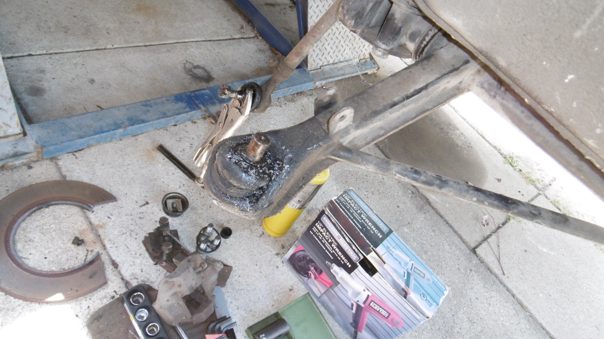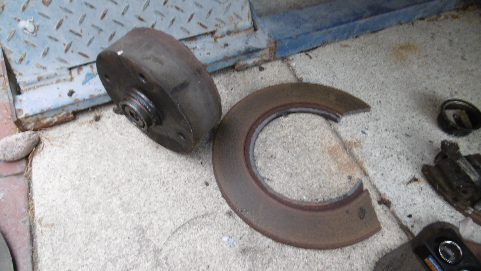 Finally found the right tool to get the grease cap off ... forgot I had one of these in the tool box (IMG:style_emoticons/default/screwy.gif) ![]() Unbolted and moved the caliper out of the way, unscrewed the axle nut and the rotor came tumbling off in two pieces. Apparently, the hat portion had broken completely away from the disc during the accident. The broken bits might make for a nice trophy for some future 914 event (IMG:style_emoticons/default/rolleyes.gif) With all that removed, one can clearly see that the spindle got bent downward real good. Glad that I have all new stuff waiting to go in there (IMG:style_emoticons/default/shades.gif) FILM at 11 ... (IMG:style_emoticons/default/popcorn[1].gif) |