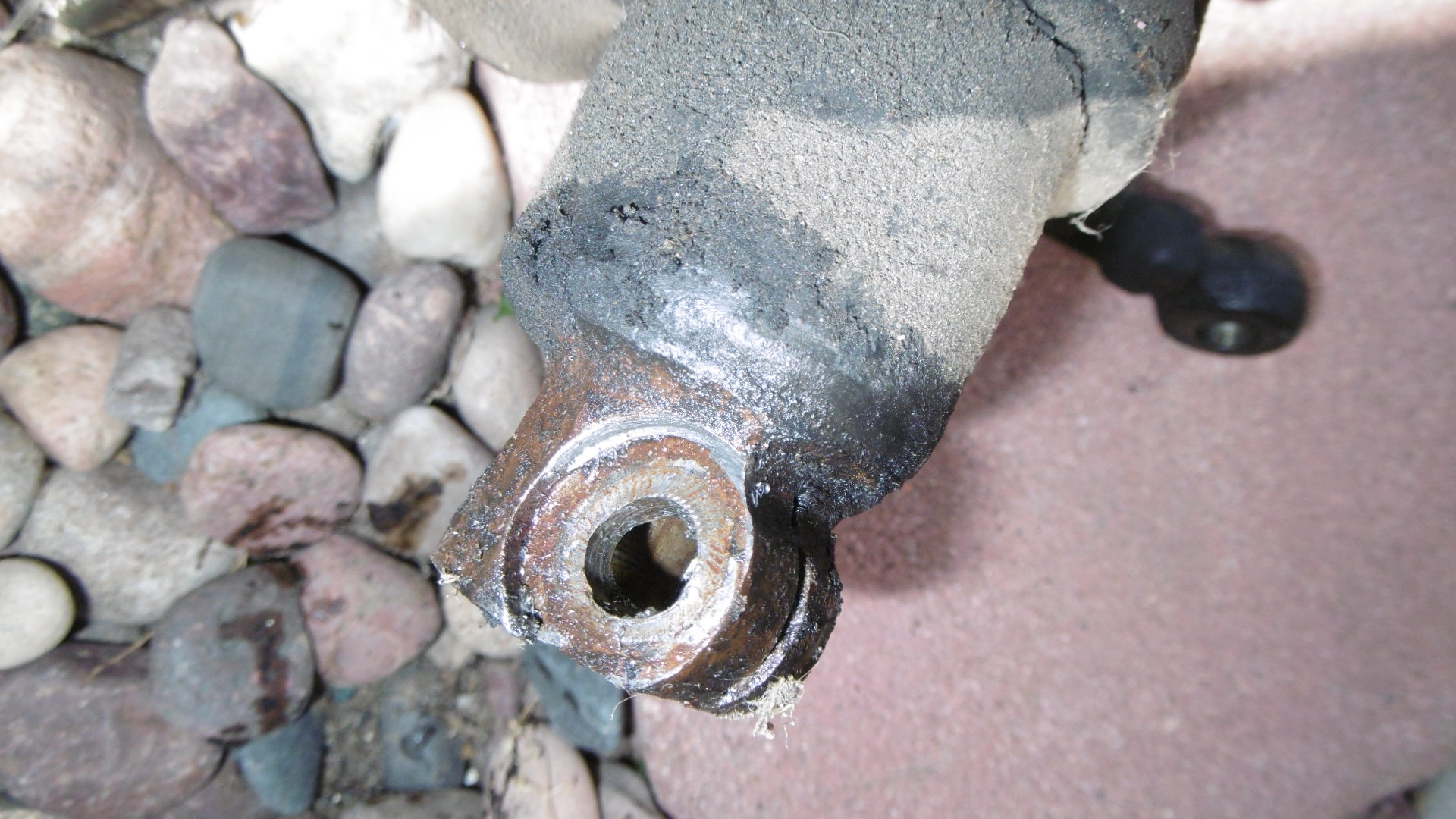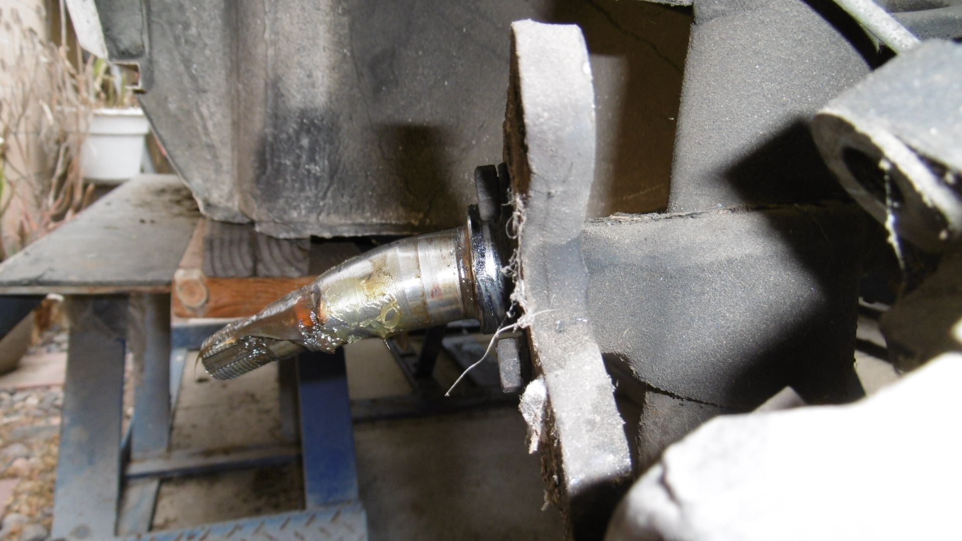 I'll take a closer look at the rear suspension's issue shortly, Kent. Can you highlight the area you're referencing? Hopefully it's not too complicated of a fix ? (IMG:style_emoticons/default/confused24.gif) Finally found the right tool to get the grease cap off ... forgot I had one of these in the tool box (IMG:style_emoticons/default/screwy.gif) Unbolted and moved the caliper out of the way, unscrewed the axle nut and the rotor came tumbling off in two pieces. Apparently, the hat portion had broken completely away from the disc during the accident. The broken bits might make for a nice trophy for some future 914 event (IMG:style_emoticons/default/rolleyes.gif) With all that removed, one can clearly see that the spindle got bent downward real good. Glad that I have all new stuff waiting to go in there (IMG:style_emoticons/default/shades.gif) FILM at 11 ... (IMG:style_emoticons/default/popcorn[1].gif) That spindle is ugly!! quite a bit of force required I would for sure get the chassis on a bench to confirm dimensions and look close for other damage. |