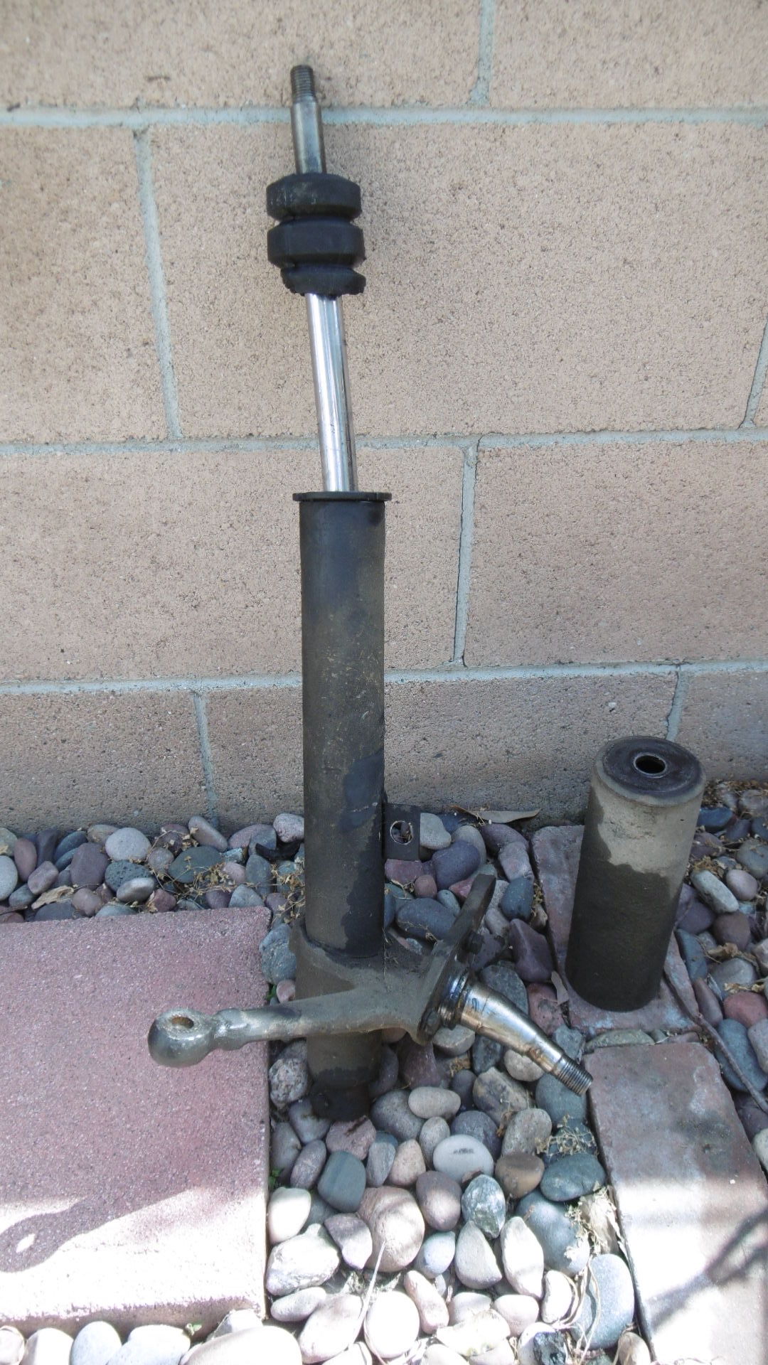 The pinch bolt on the strut sheared off when I tried loosening it, so I had to drill it out. With a little persuasion, the ball joint came loose. Removing the tie rod end took a little more ooomph from a large hammer (IMG:style_emoticons/default/smash.gif) The control arm doesn't look like it took a hit, but I have refurbished 'late' ones going in when I'm ready to start reinstalling the all the 'new' suspension components. With the bent strut out, confirmed that the insert had also suffered the impact effects as well. Looking elsewhere uncovered some additional minor damage under the trunk pan. This should be an easy fix with the hammer and dolly method (IMG:style_emoticons/default/popcorn[1].gif) EDIT: I just remembered that I still have a pair of early struts at my place in AZ. I think I'll install the passenger side strut just so I can get HOWARD rolling straight again (IMG:style_emoticons/default/idea.gif) I need to drop him off at a body shop to straighten out some dents and get a fresh paint job before changing out all the suspension goodies anyway. Yeah. |