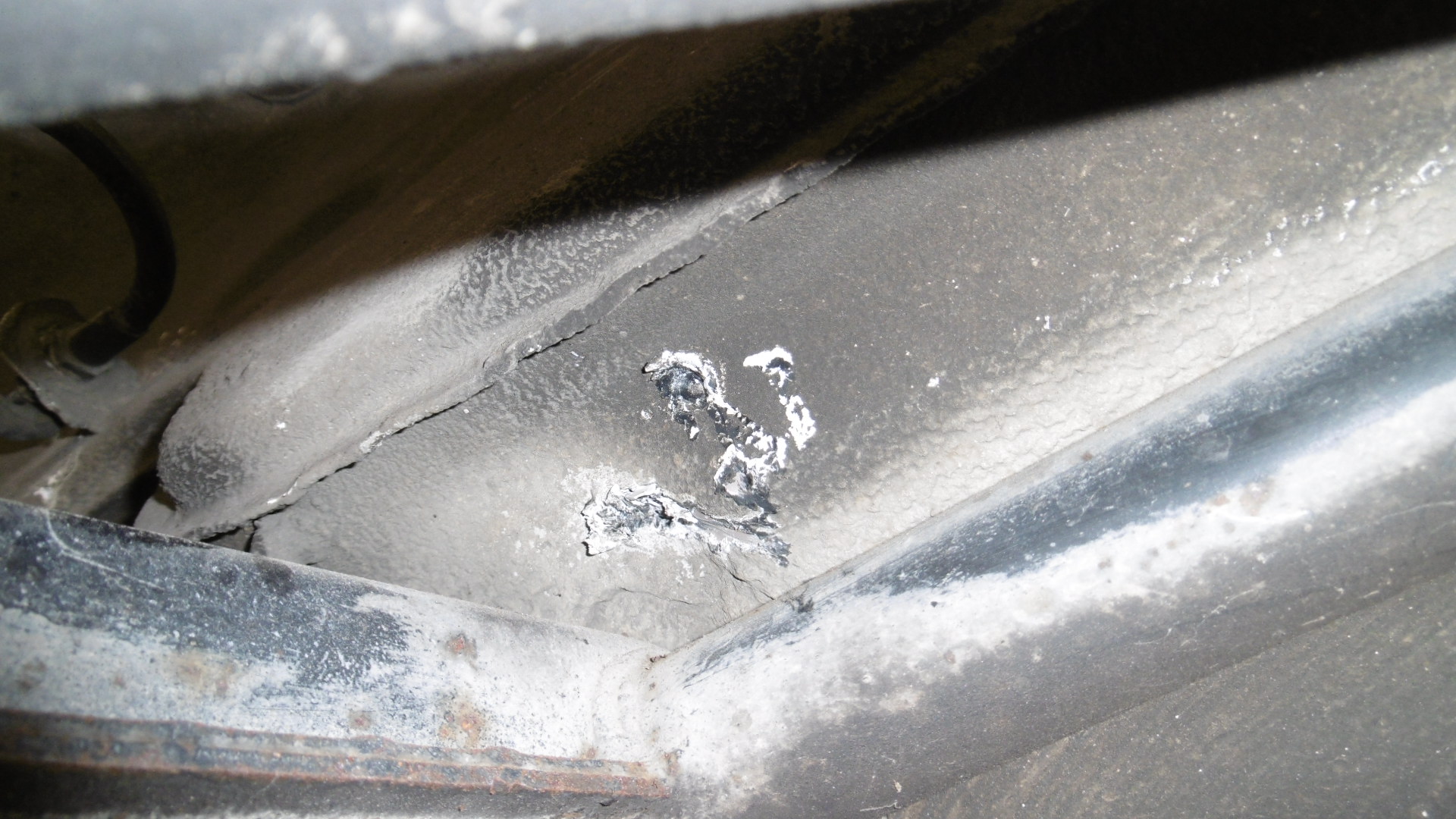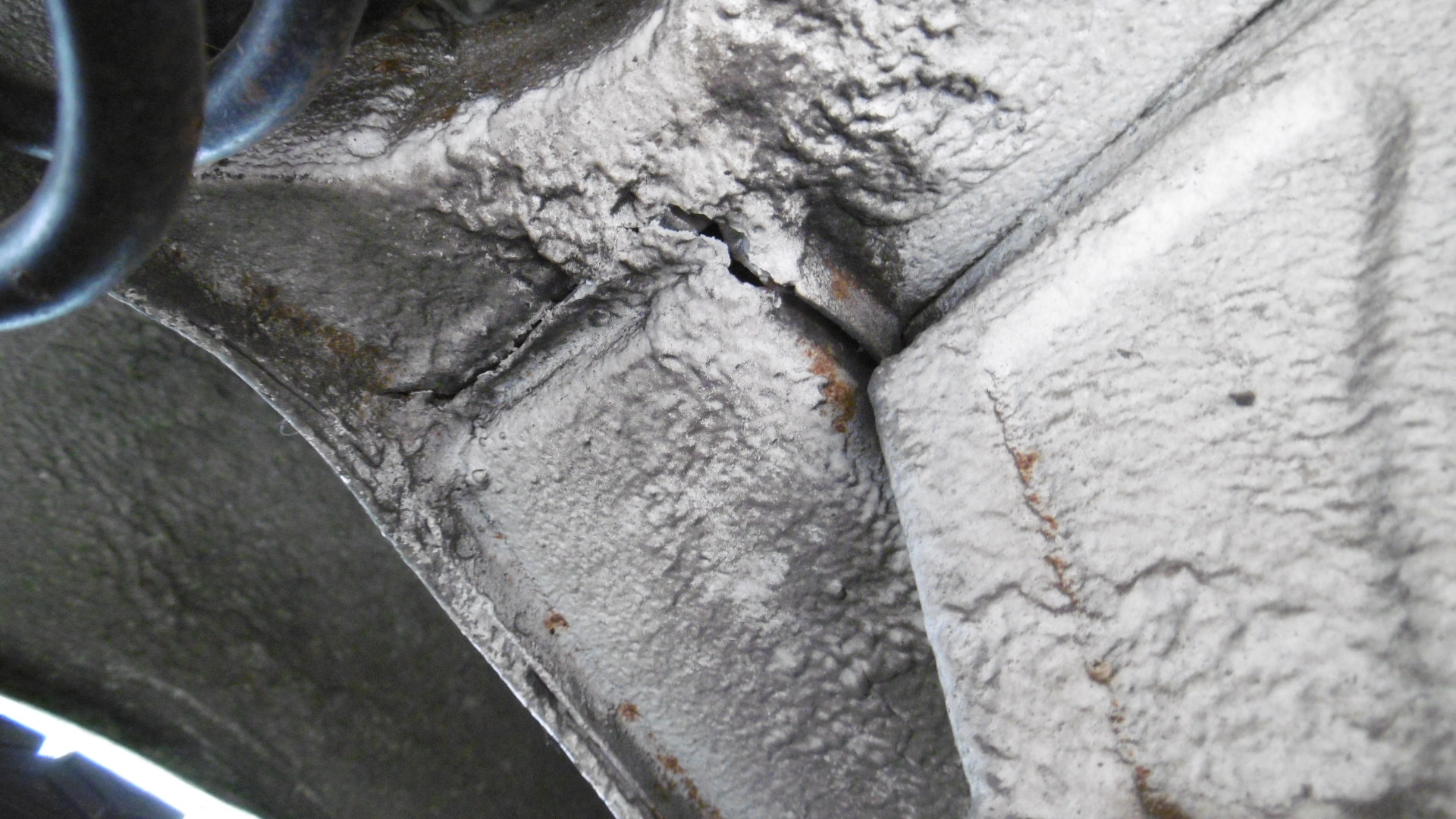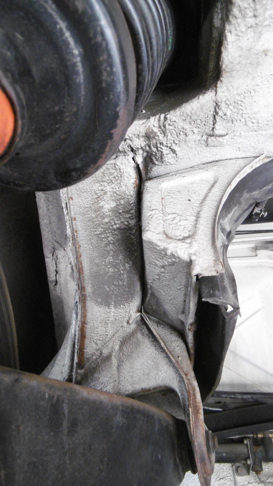 Driver's side long is a little dirty, but looks rather well preserved, rust wise. Will take a peek at the passenger's side tomorrow. Took a quick look-see at the left trailing arm mounts - doesn't really look like anything is awry with the uni-body structure. Maybe just the trailing arm is bent at the pivot point, or the alignment plates got moved a bit? (IMG:style_emoticons/default/confused24.gif) I'll have to take some measurements when it's up in the air, and mirror them from the passenger side's measurements to be sure what's actually going on (IMG:style_emoticons/default/idea.gif) Mark, in that 2nd pic it looks like the inboard attach point is bent. See the cracked silver paint and the circular flanged part has a gap too. Now you can get that welder out and put it to work. (IMG:style_emoticons/default/beerchug.gif) |