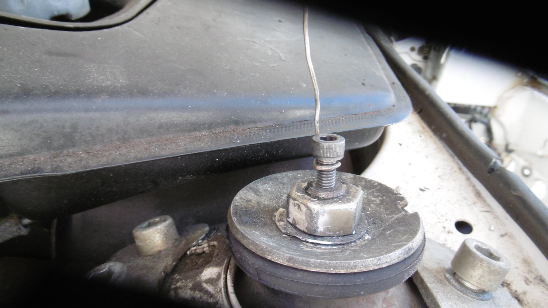 I finally noticed that the the stem had inside threads, so screwed in a 6mm bolt with some bailing wire and pushed the bailing wire up through the mount, so my assistant could pull the stem up enough to get the washers & nut on it. EDIT: Found a 10x30 pinch bolt for the bottom of the strut in my stash of metric hardware (IMG:style_emoticons/default/mueba.gif) |