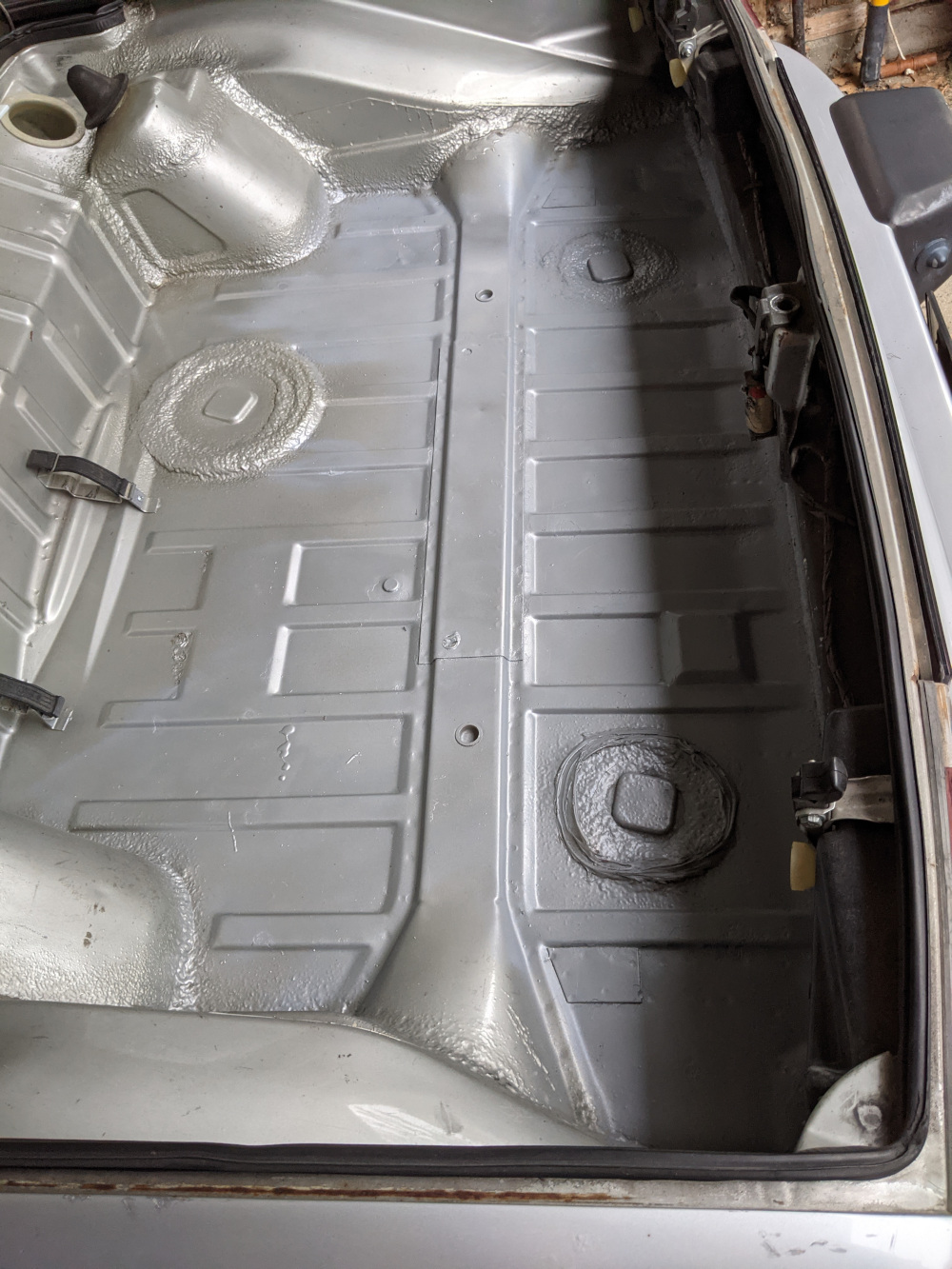 The dash pad looks really good. Someday I will have to tackle that. Today, I sandblasted the surface rust in the trunk. I lifted the pad at the last race and was shocked to see it. Not going to let that get started. Need to go get the paint matched in the trunk for a rattle can but at least I got the rust out and some primer down. |