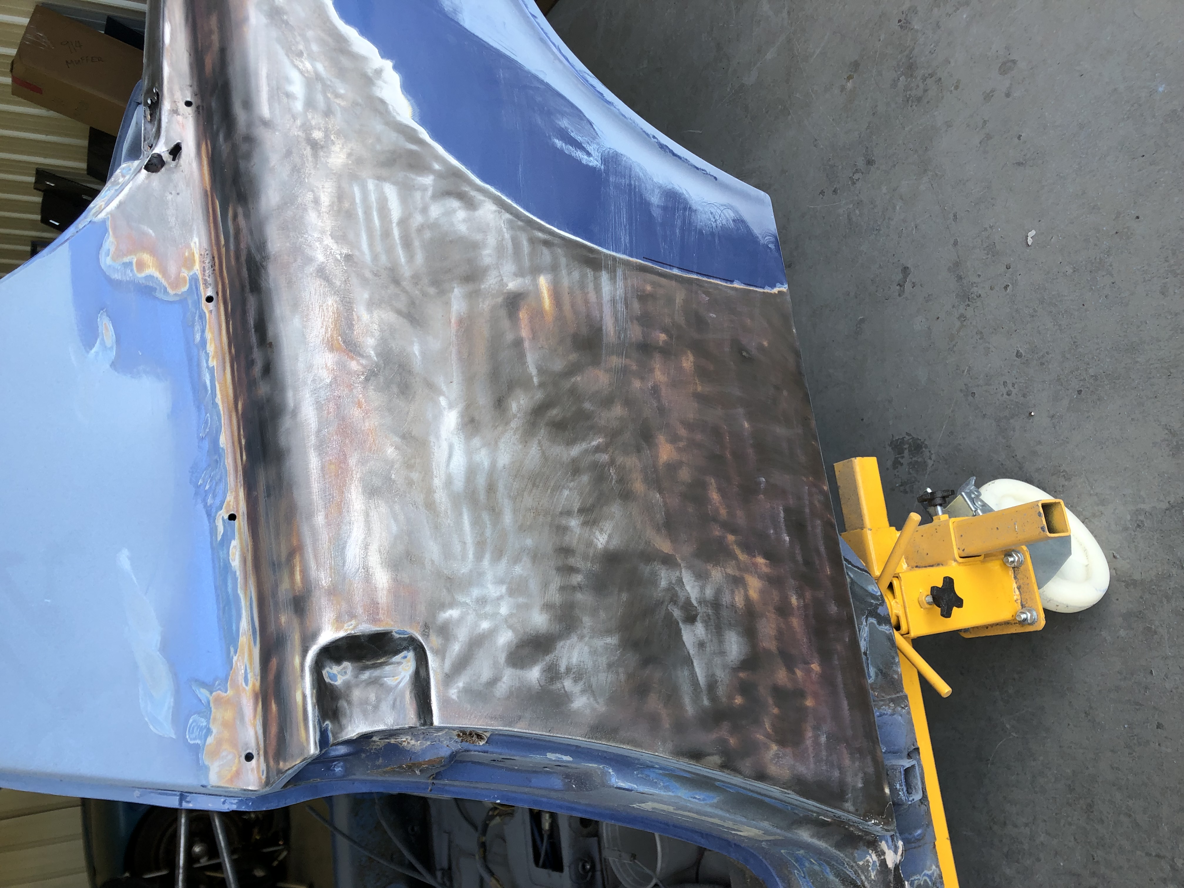 I spent yesterday taking the paint and bondo off the rest of the fenders and found another fine mess the POs left for me. I have a couple of local sources looking for a replacement corner. How does that even happen? Was it a rust repair, accident repair, or both. I assume it was rust repair as the floor is straight. The PO said it must have been done before he bought it (IMG:style_emoticons/default/dry.gif) Hopefully that was the last of bondo to remove. The rest of that fender look good except for some rust holes by the sail |