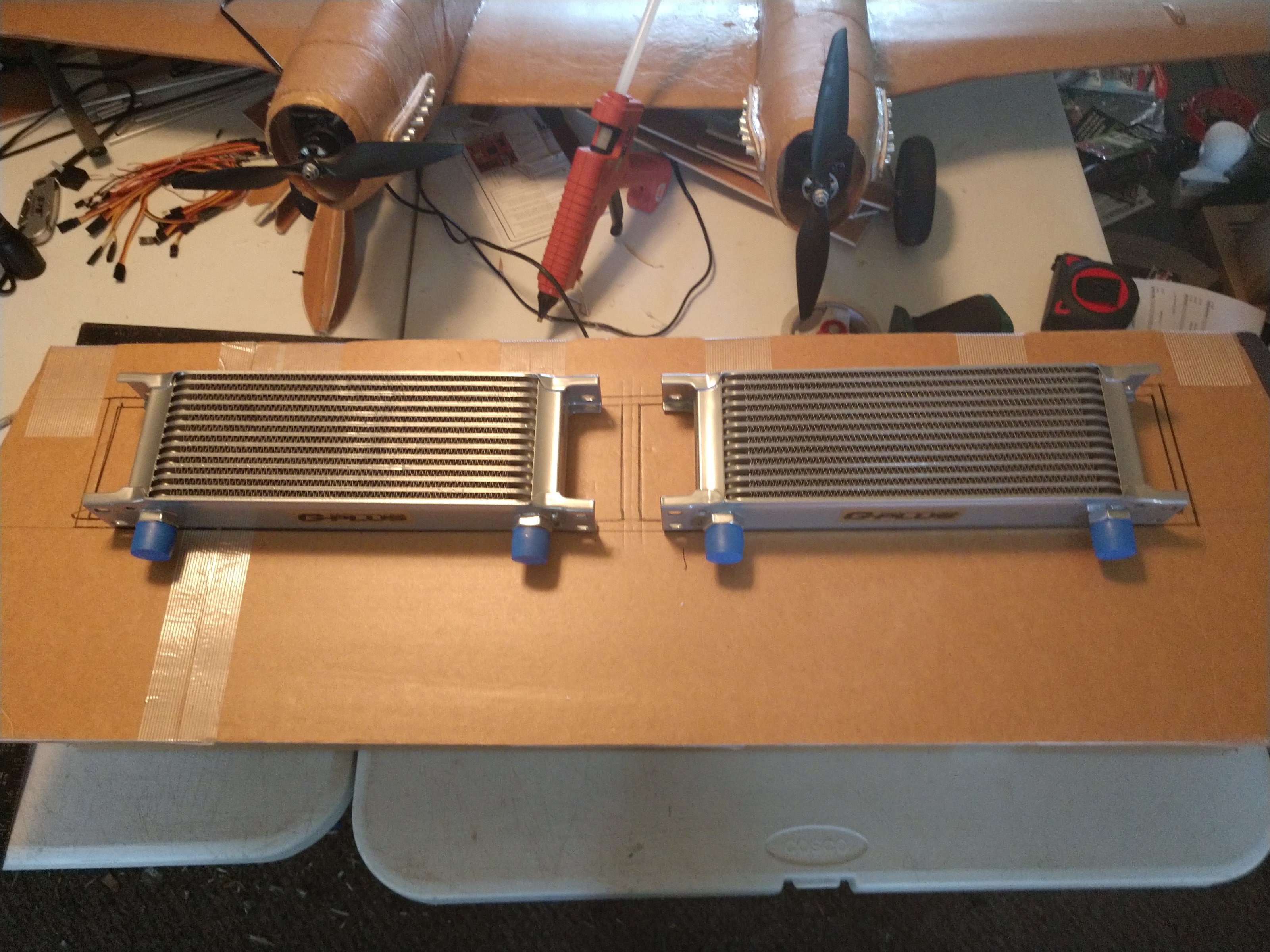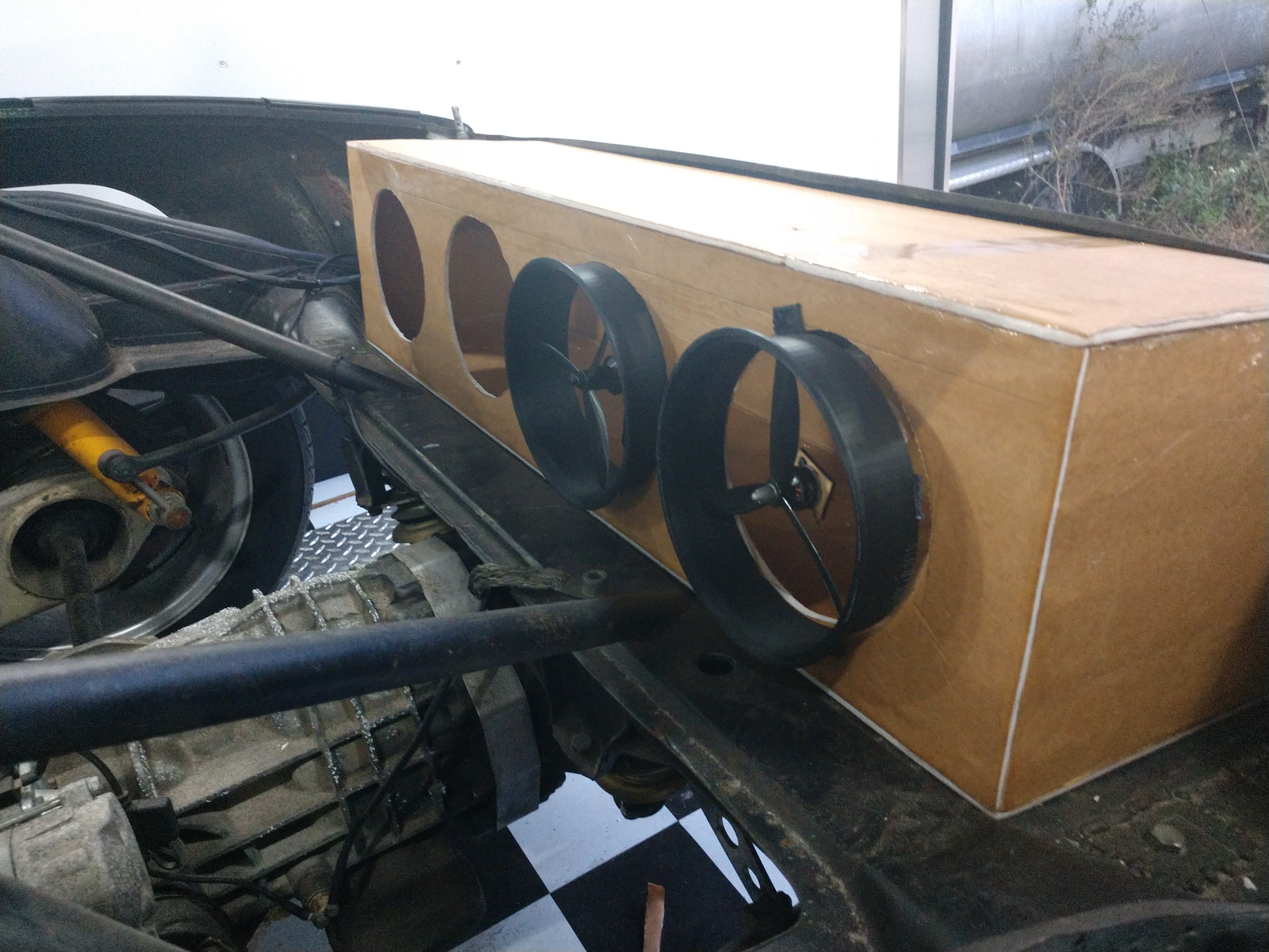 Working on an oil cooler for the race car. Radiators going on the rear panel in-between the tail lights. 4 vents across the back of the car. I'm putting 2 13 row coolers the coolers just arived. They will go in this box.