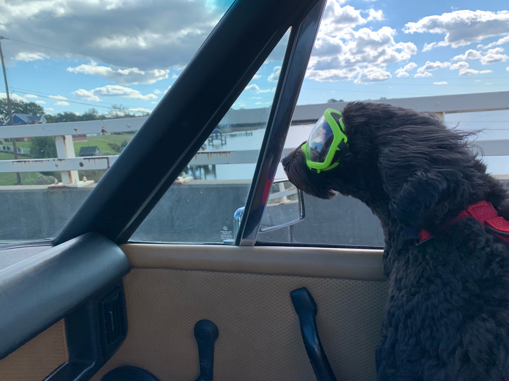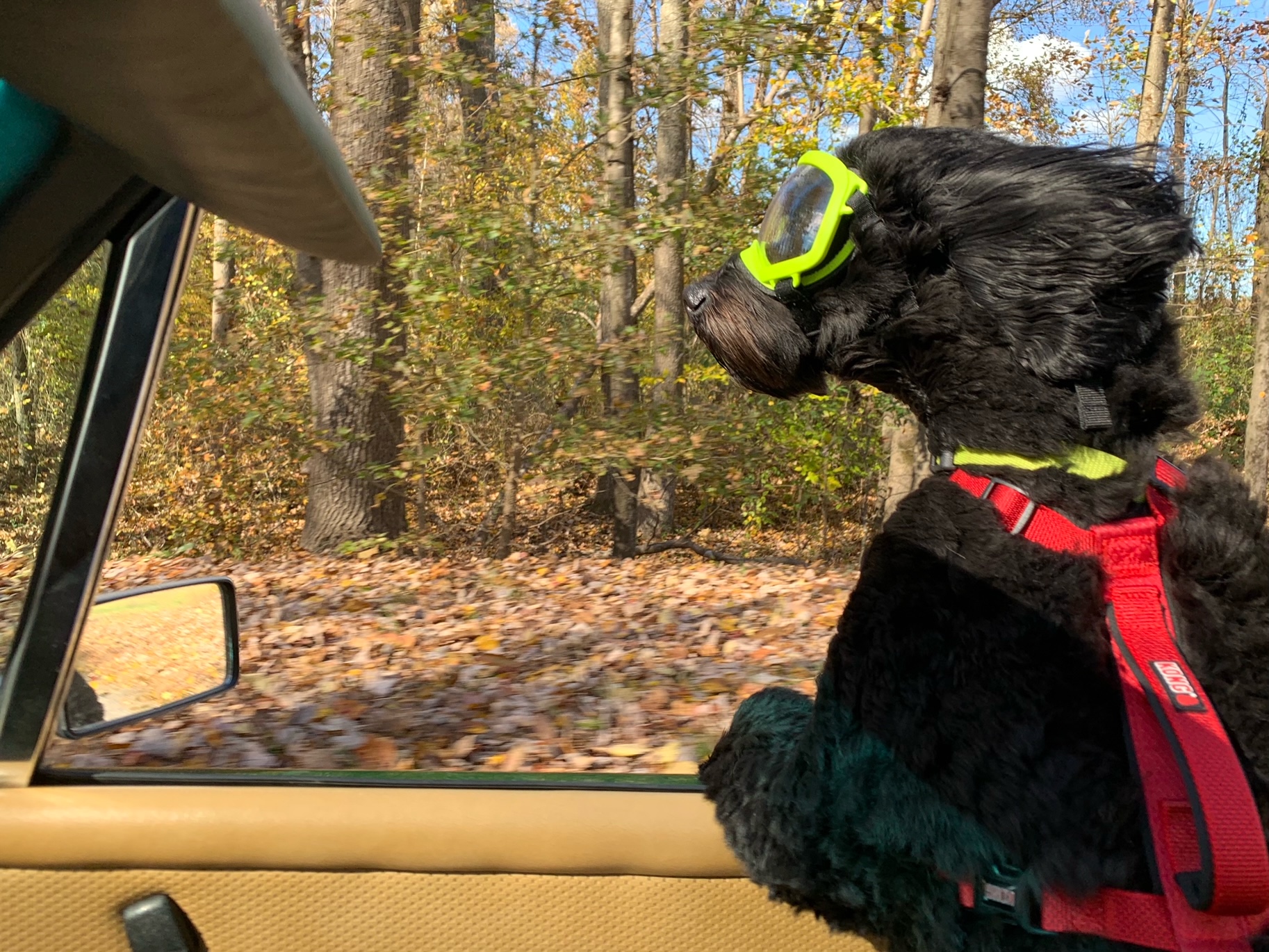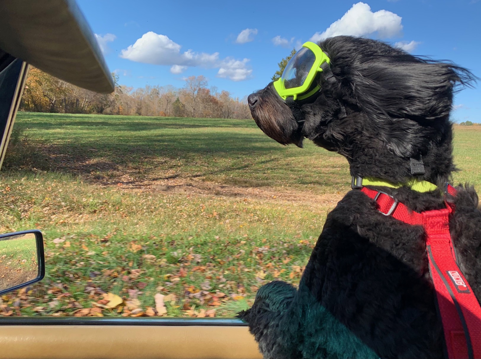 One happy pooch, bet he appreciates the goggles.