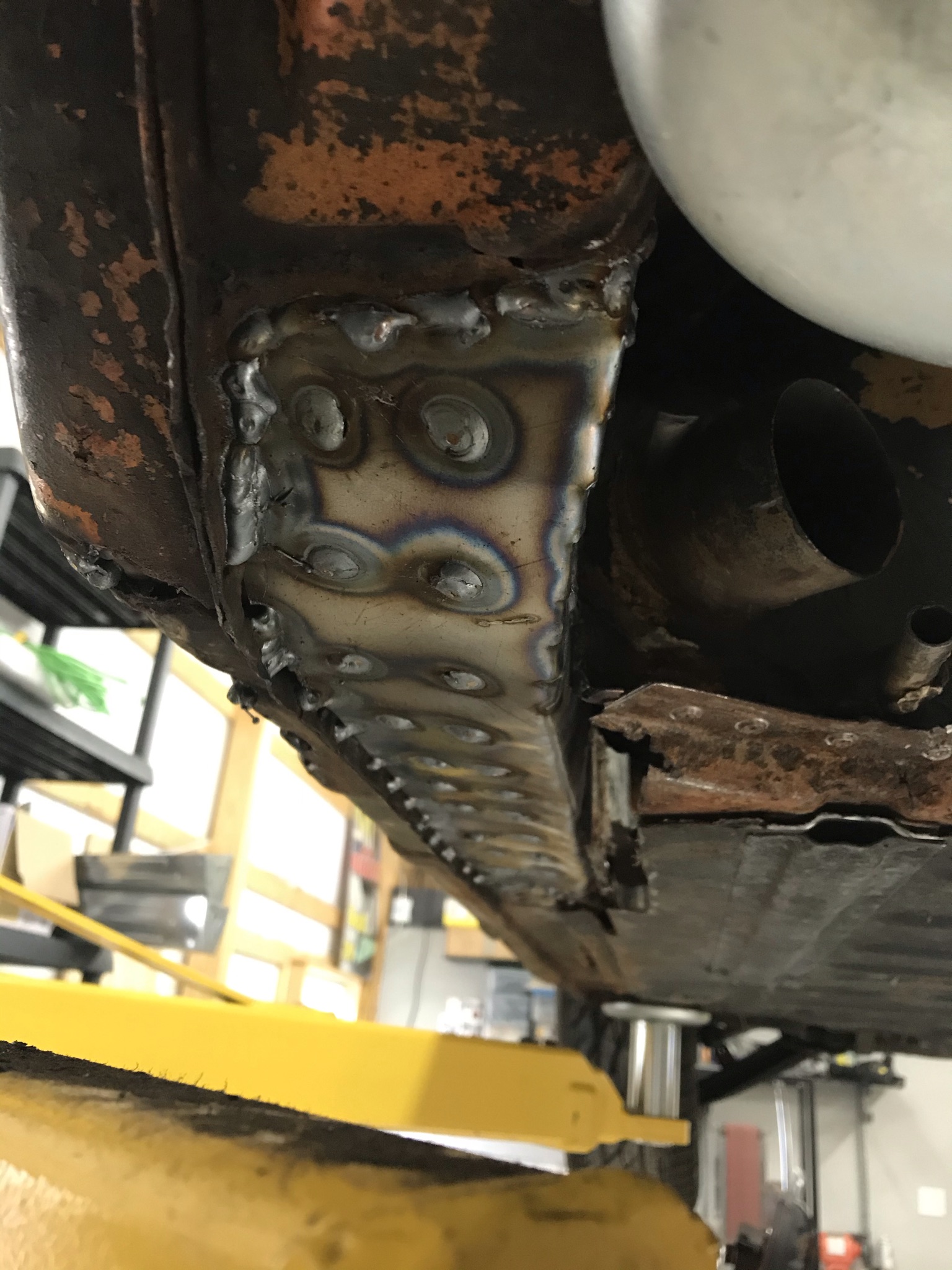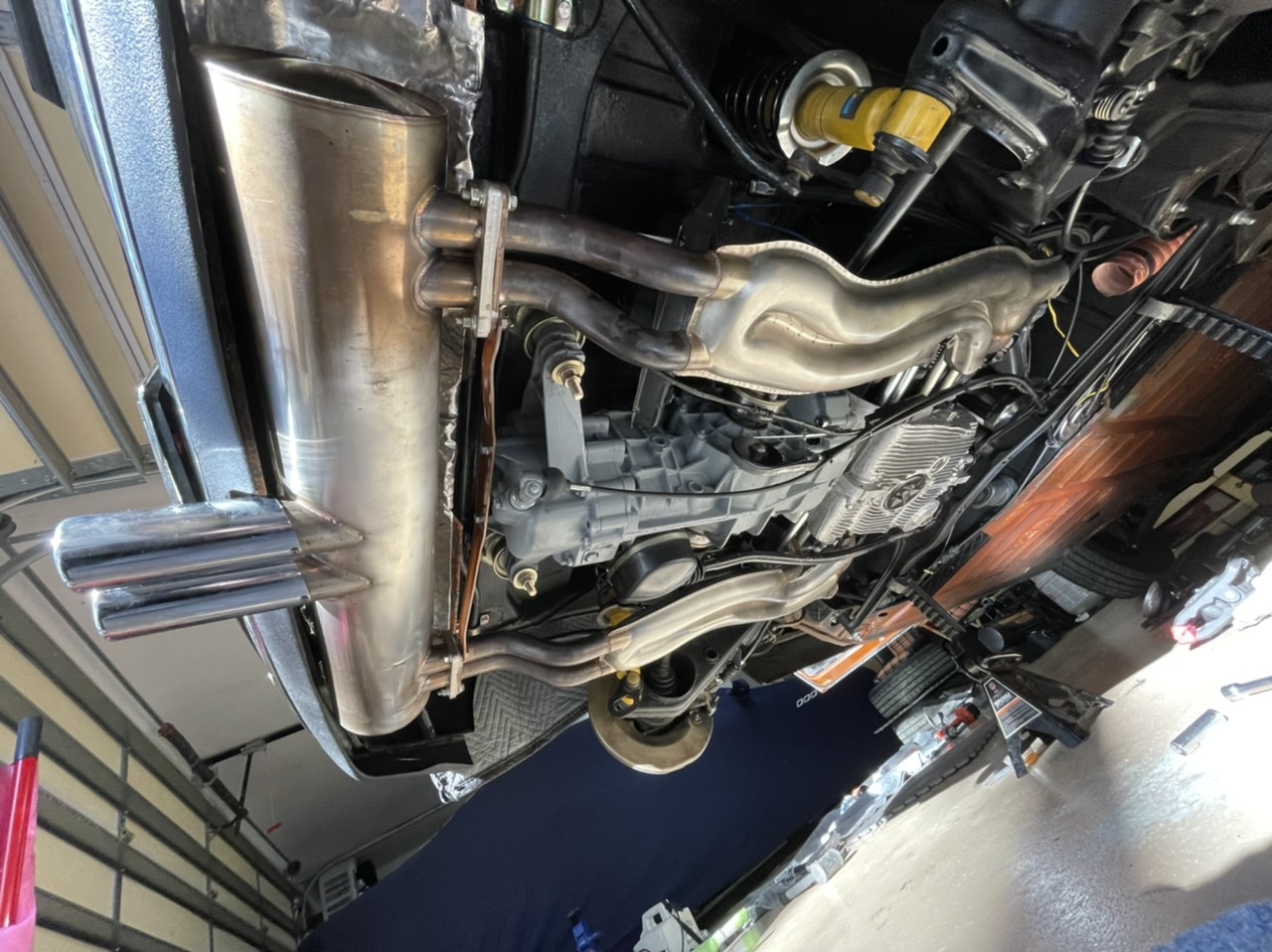 I have a 914 in the shop getting a full resto and I needed a cart to move the bare chassis around the shop. These ended up being more like stilts than a traditional cart. I got them back from the powdercoater last week and I finally had time to get them mounted. They put the car at a great working height in order to tackle some of the preliminary rust repair, flare install, etc.