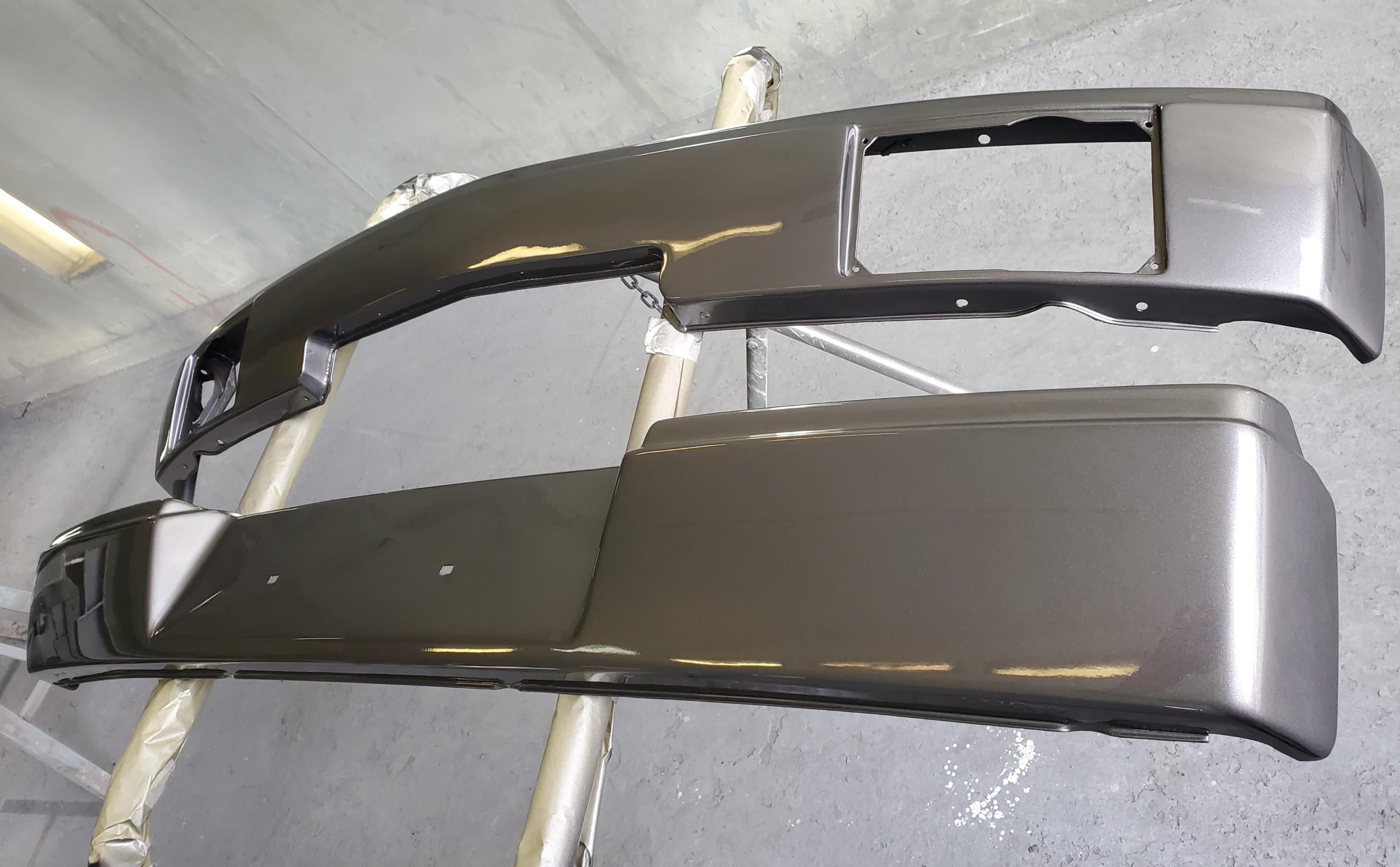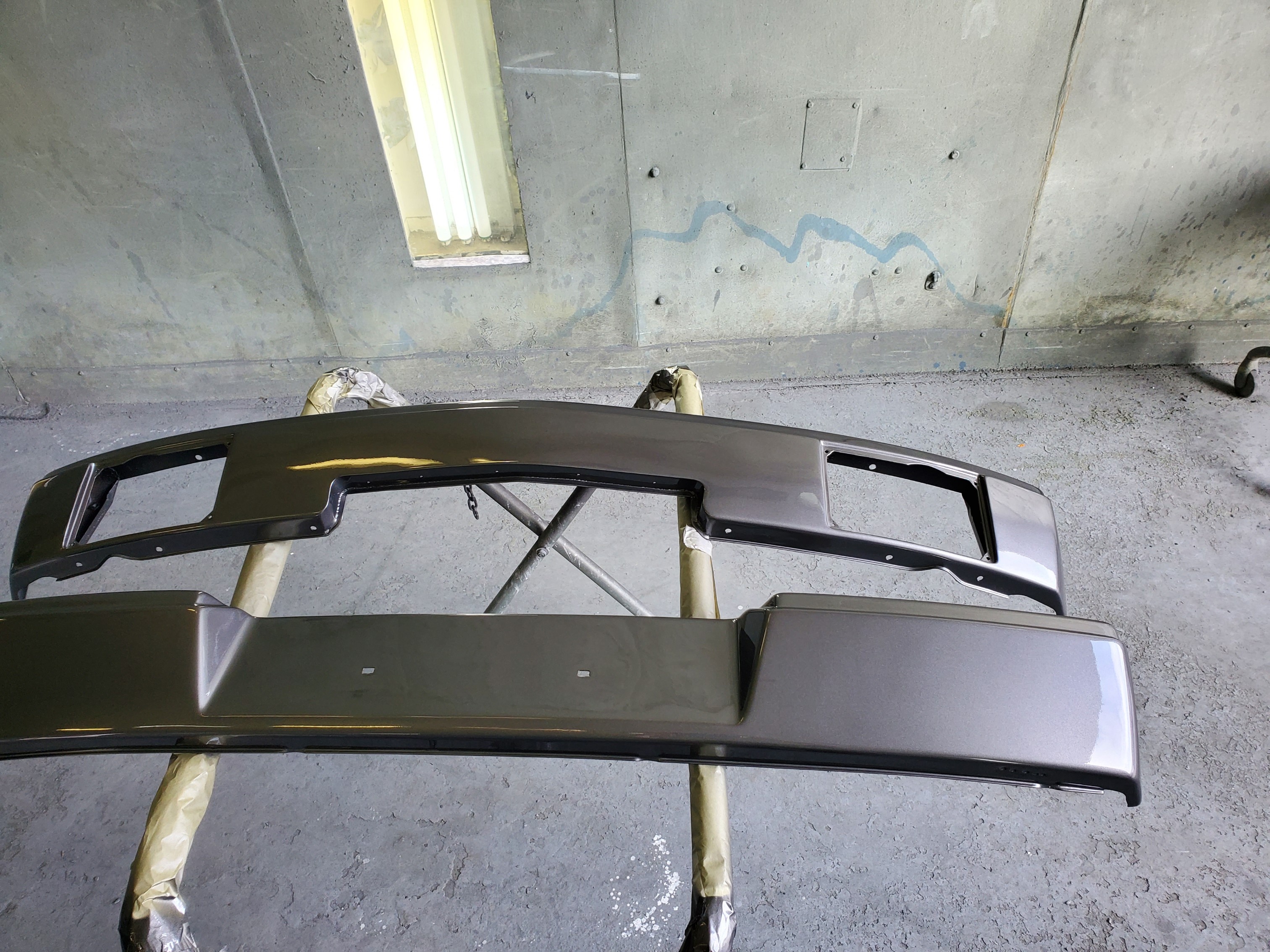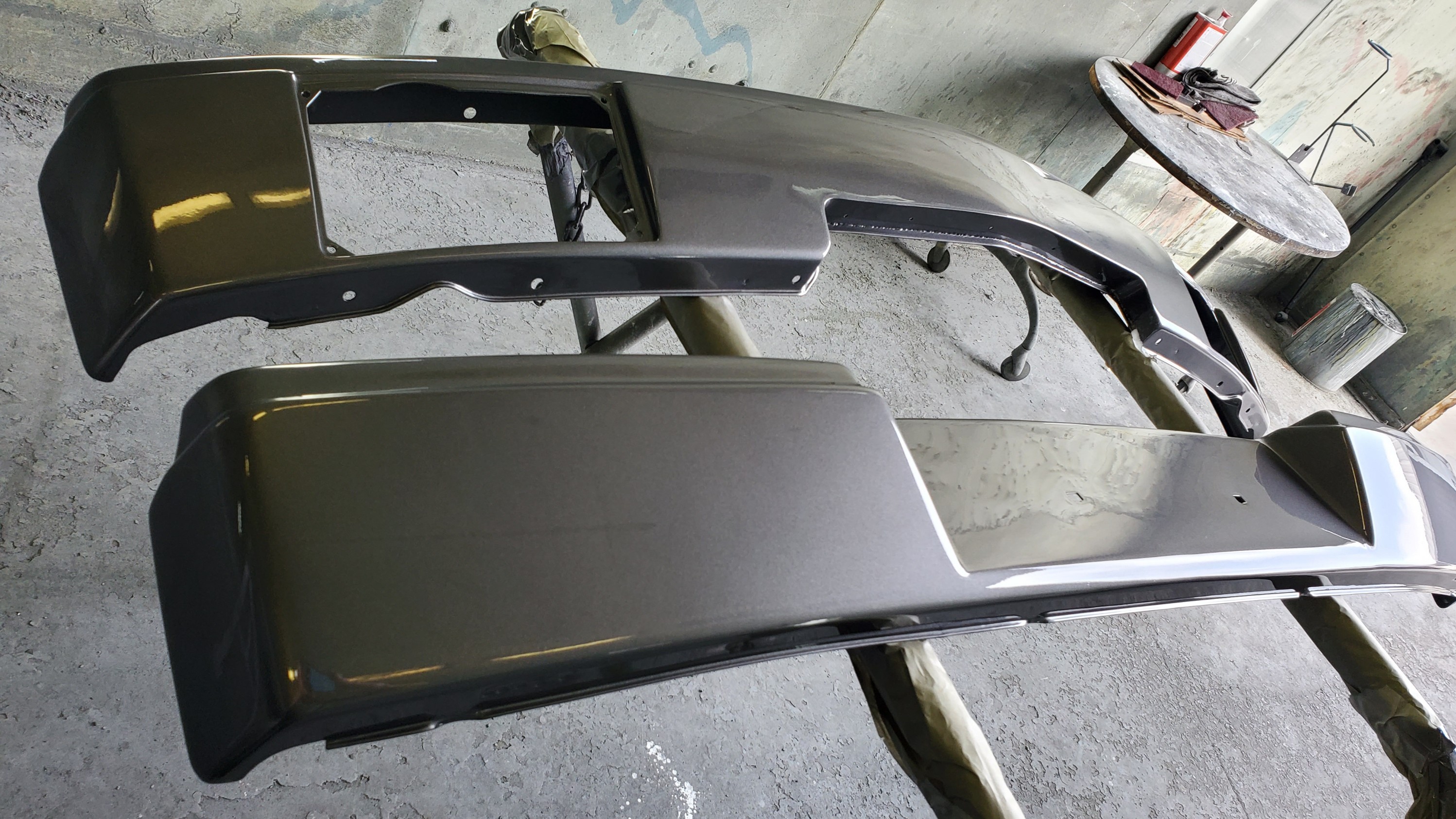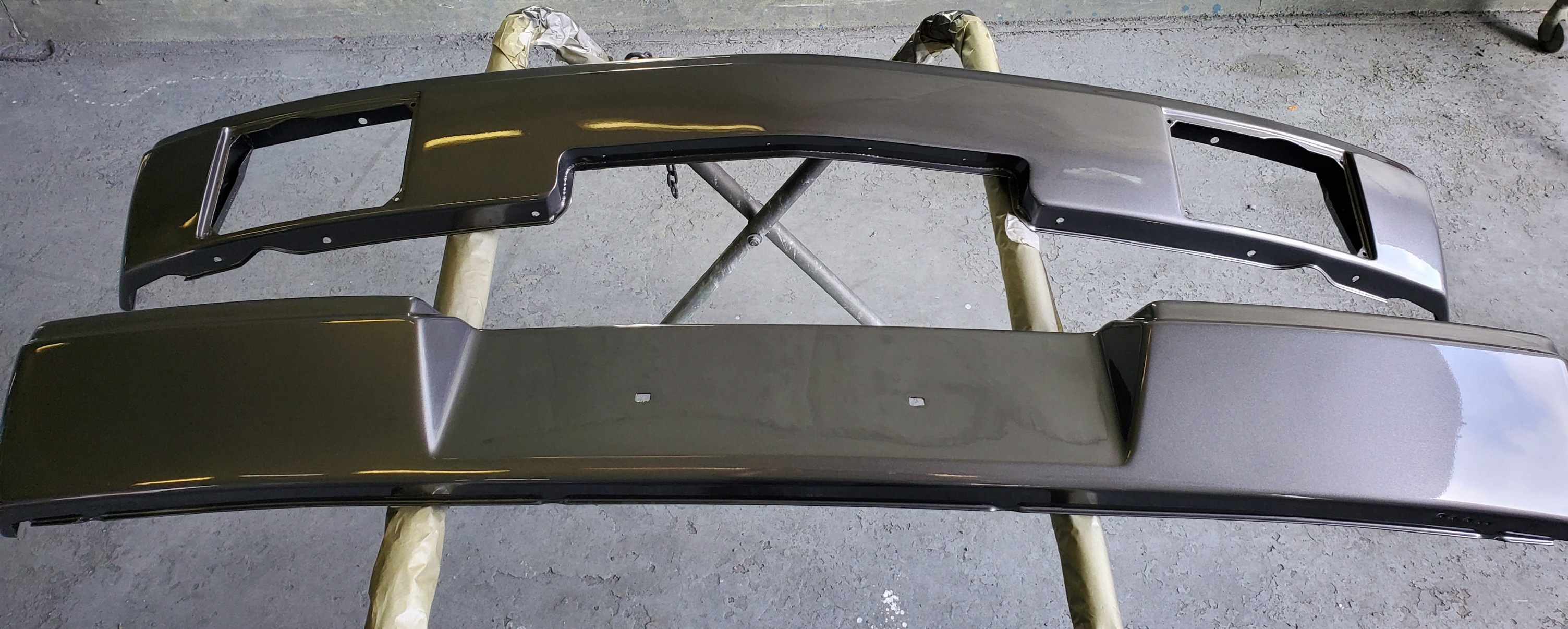 I just refurbished a set of early bumpers in metallic gray. the rear was pretty banged up and twisted but it's presentable now. I shaved the tow hook access hole. The front is a GT modified from @mb911