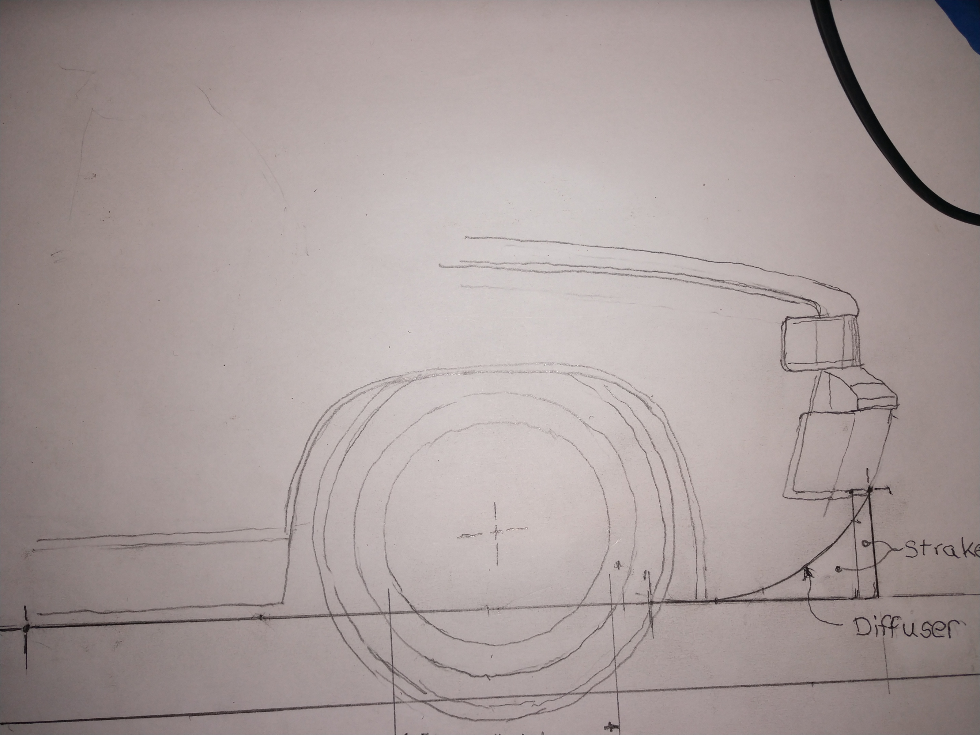 Started thinking about the rear diffuser. This is not an easy task. If it works well I will be able to leave the rear wing off. The diffuser will go under the exhaust flanges and I am trying to tie it into the rear bumper.