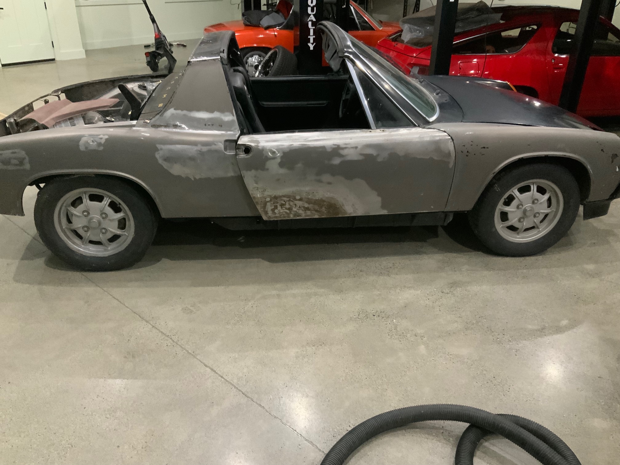 Did the car on the lift shuffle today. Sons 944 came off and was awakened from winter slumber. 914 is on the lift. Gotta finish body work over the next week and respray driver side. Then EFI setup with the computer. Getting close