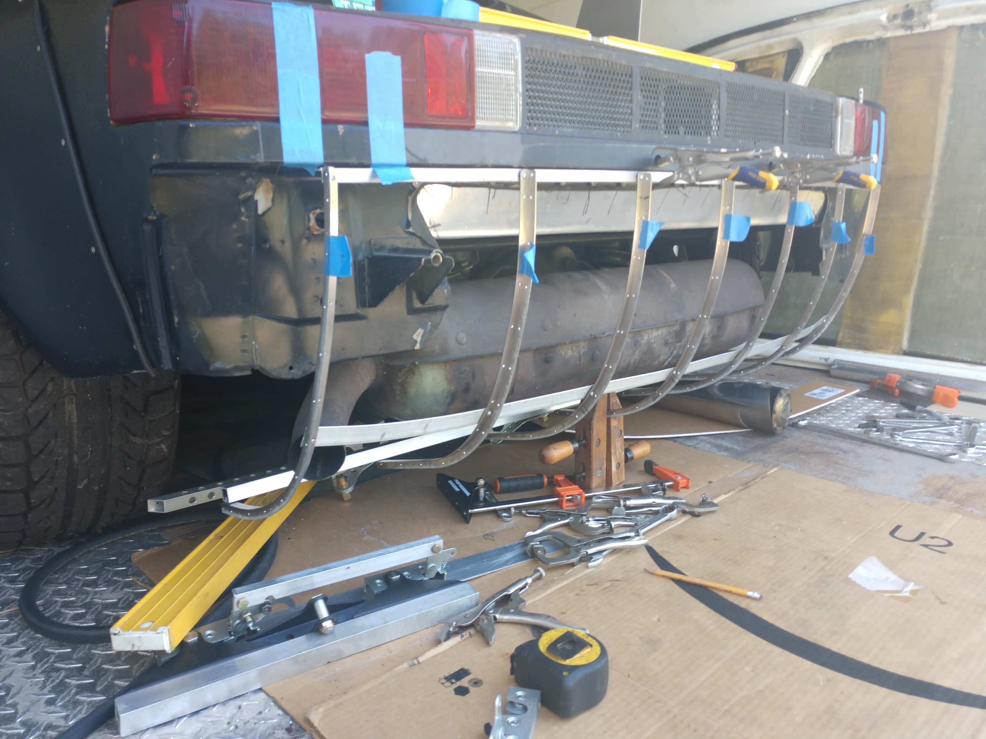 The skin goes on the inside of the frame. The aluminum angles get the strakes attached to them. The hole thing goes from the muffler bracket to the body line that is at the top of where the rubber bumper top was. |