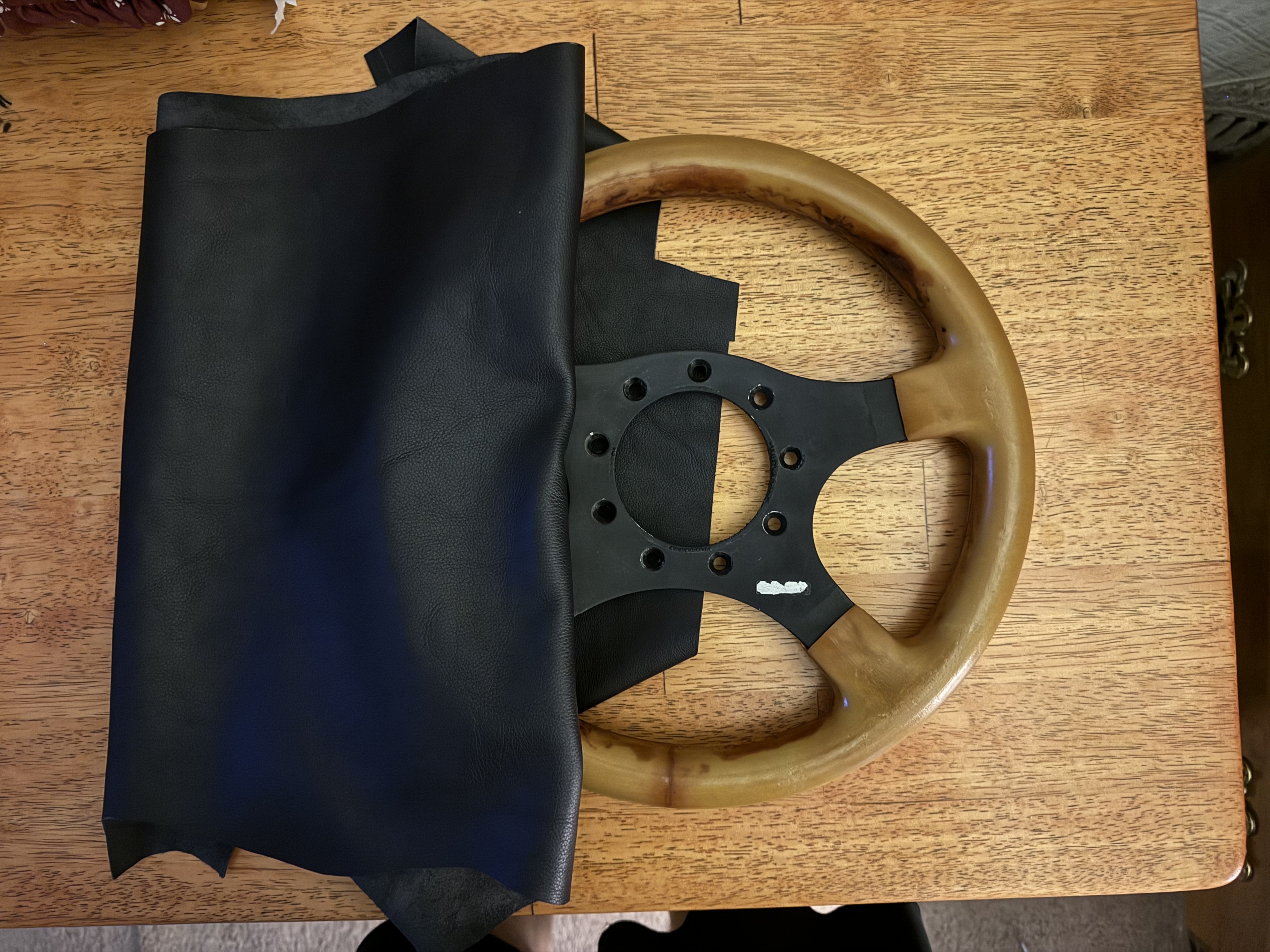 Painted the center with a wrinkle finish in preparation for wrapping. Wrapping will go slow. (IMG:style_emoticons/default/sad.gif) Your wrinkle finish came out excellent! What brand did you use? Any special drying tricks? Thanks. VHT high temp wrinkle plus ( SP201 BLACK WRINKLE. ) it takes a lot of paint. Start with light fog. Wait three minutes and start painting a heavy coat horizontally. Wait five minutes. Paint a heavy coat vertically, 5 minutes and one more heavy coat diagonally. Then you pop it into an oven at 170-200 degrees for an hour. The oven part is really important to get an even wrinkle. I used a primer but it works fine without if your painting surface it nice. Best part is and hour (+-) after is is out of the oven it is ready to work with. |