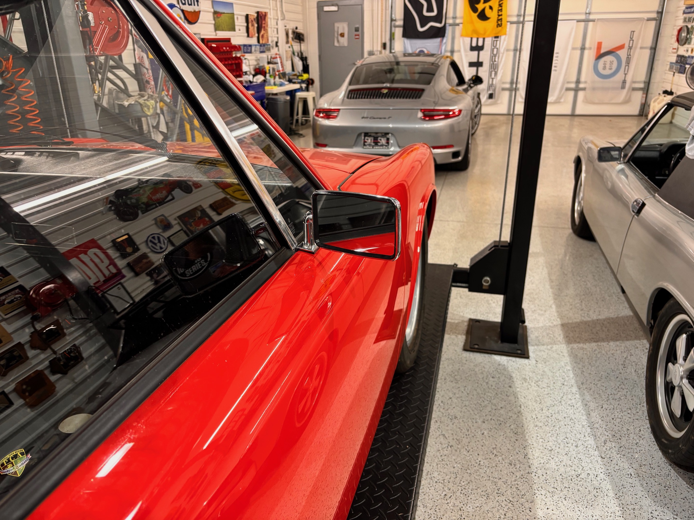 1) Replaced new master cylinder that failed after 100 miles. This time put an Ate MC in; 2) Bled the brakes, then bled the brakes, then bled the brakes; 3) New PMB soft brake lines all around; 4) New front rotors and bearings; 5) New PMB restored front calipers; 6) New front brake pads; 7) New right rear trailing arm pivot bushings; 8) Valve adjustment; 9) New valve cover gaskets. It took two tries to stop the leaking from one of them. Just couldn't get it on perfectly straight the first time; 10) New 914Rubber speedometer gear bushing; 11) New 914Rubber LE front spoiler that fits over the 914Rubber tow bar; 12) Replaced the Riviera's with a set of Fuchs with nearly new tires that came off a car that the new owner did a five lug conversion on; 13) New firewall shift bushing. Now shifts better than any 914 has a right too; 14) Put on turbo tie rods; 15) Oil and filter change; 16) Transaxle oil change. I might be a bit premature in my victory dance as I am taking it in for alignment the day after tomorrow. Trying not to drive it before then, but it did perfectly on a two mile drive. I think I got the alignment pretty close. I was at a rally the other day and told a few fellow owners I was going to replace the MC the next day. Got several looks of pity and a few pats on the back. That has got to be one of the more miserable jobs to do on our cars, and I have the benefit of having a scissor lift and good tools. Then to have to do it twice because a new MC was defective (leaking at the casting plug) was a really hard pill to swallow. Pictures with the Rivieras on and then with the Fuchs on. I think it looks a lot better, but I know this is all personal preference. ![]() Got the daily driver up on the lift now to basically replace all of the subframe members, as well as the front and rear sway bar bushings and downlinks. Just got tired of the bumpy ride. Did the shocks and struts a few weeks back and that helped, but not enough. Decided to fire the parts cannon at it in a "while I'm there" moment. A lot easier to do certain parts of this job with other parts taken off. |