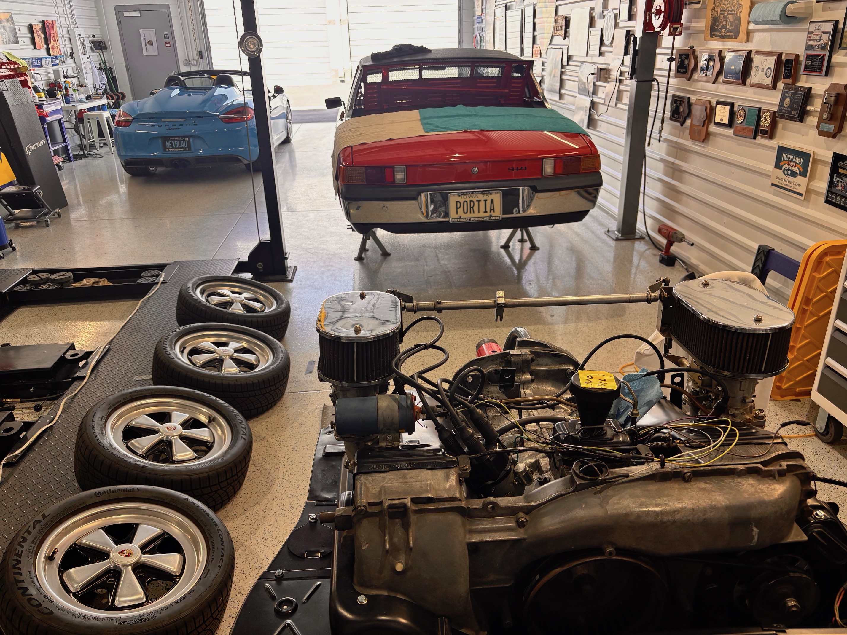 This 914 belongs to the wife of @scottthephotog , @K.T. She wanted a six, so we put in the old 2.4L MFI motor out of my six conversion. Still have a bunch of wiring and hookup work to do, but it's in there. Hopefully they make it to Okteenerfest with both their cars. |