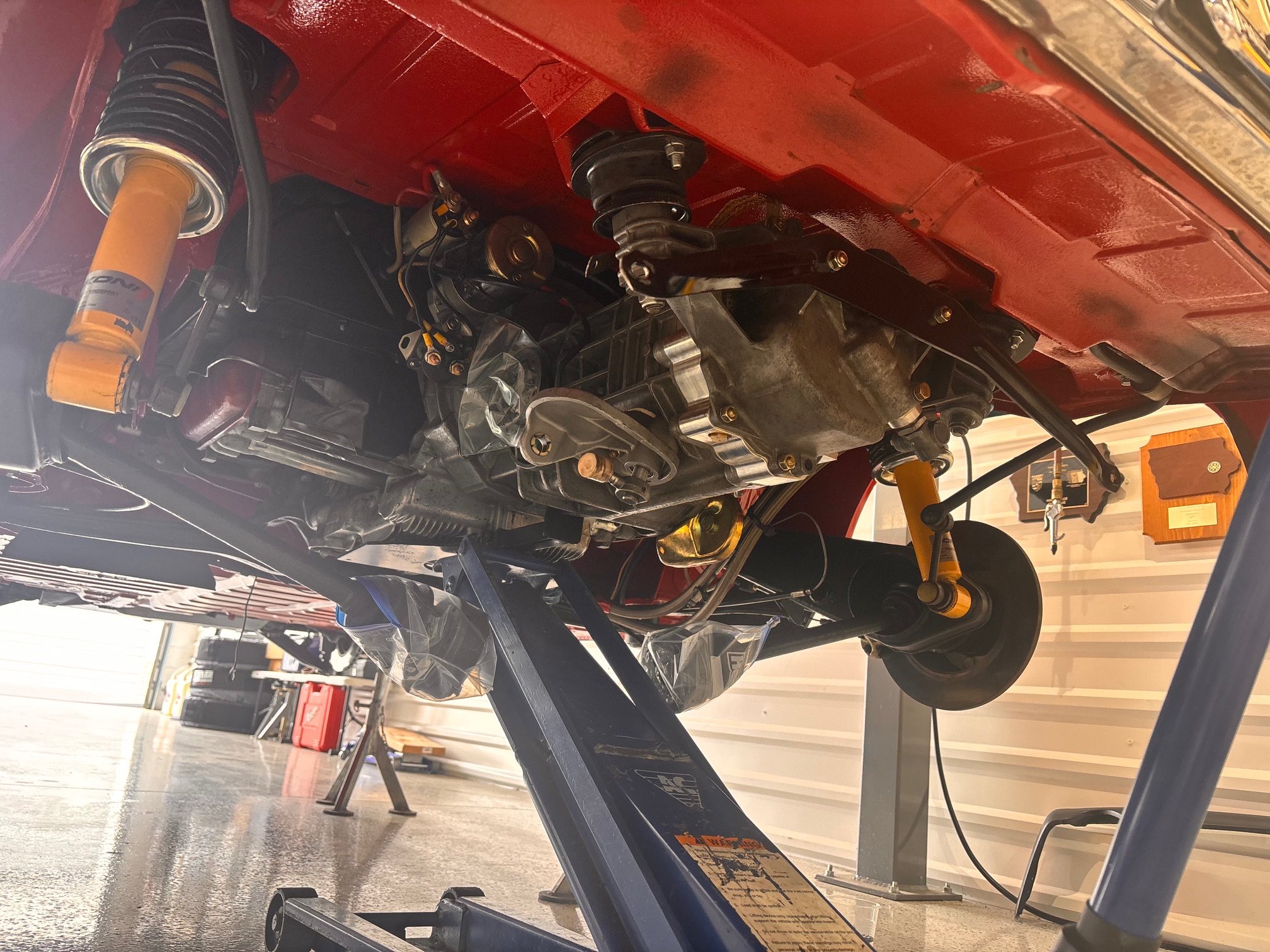 I've been cleaning up the back end while my engine is being rebuilt. Replaced a bundle of fried wiring running from the harness to the back lights. Replaced fuel lines. Added Tangerine shift bushing to firewall. Powder coated and Zinc all parts. Undercoated with POR15. New shocks and springs from Elephant Racing. The brakes will go back next.