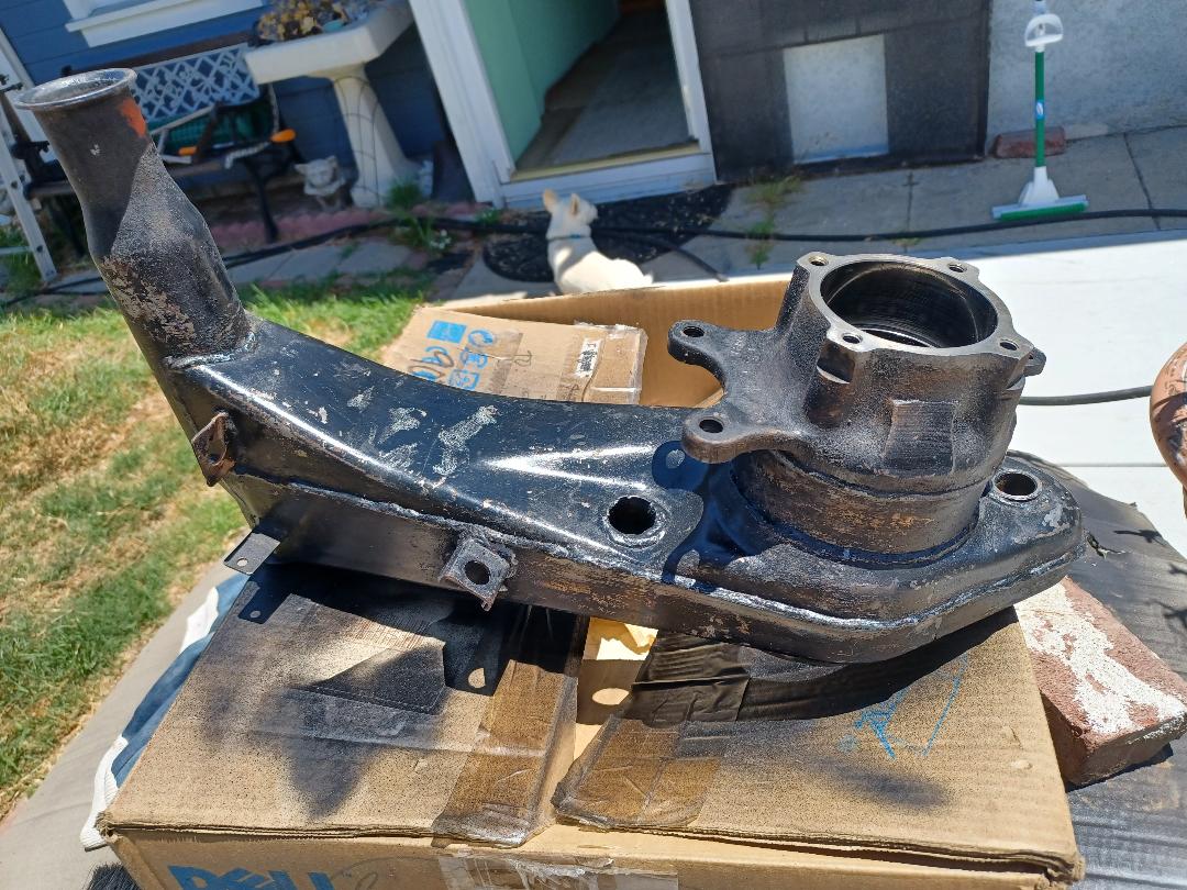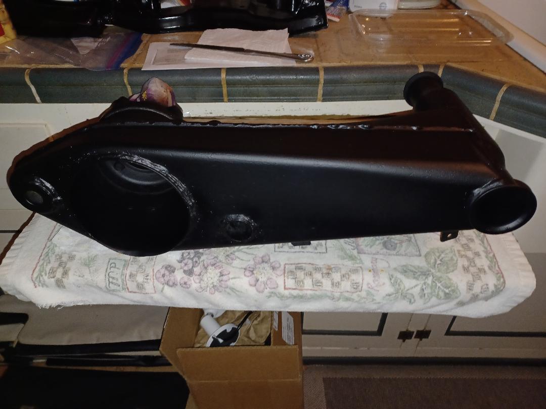 I called Bruce Stone and asked if he had a spare L/R trailing arm to replace the 'bent' one, and met up with him at Callas Rennsport a couple days ago. De-greased it and shot some black primer on it ... ... then we'll jack HOWARD up, remove the bent arm, swap all the necessary parts and install it to see if it cures the issue (IMG:style_emoticons/default/confused24.gif) ... |