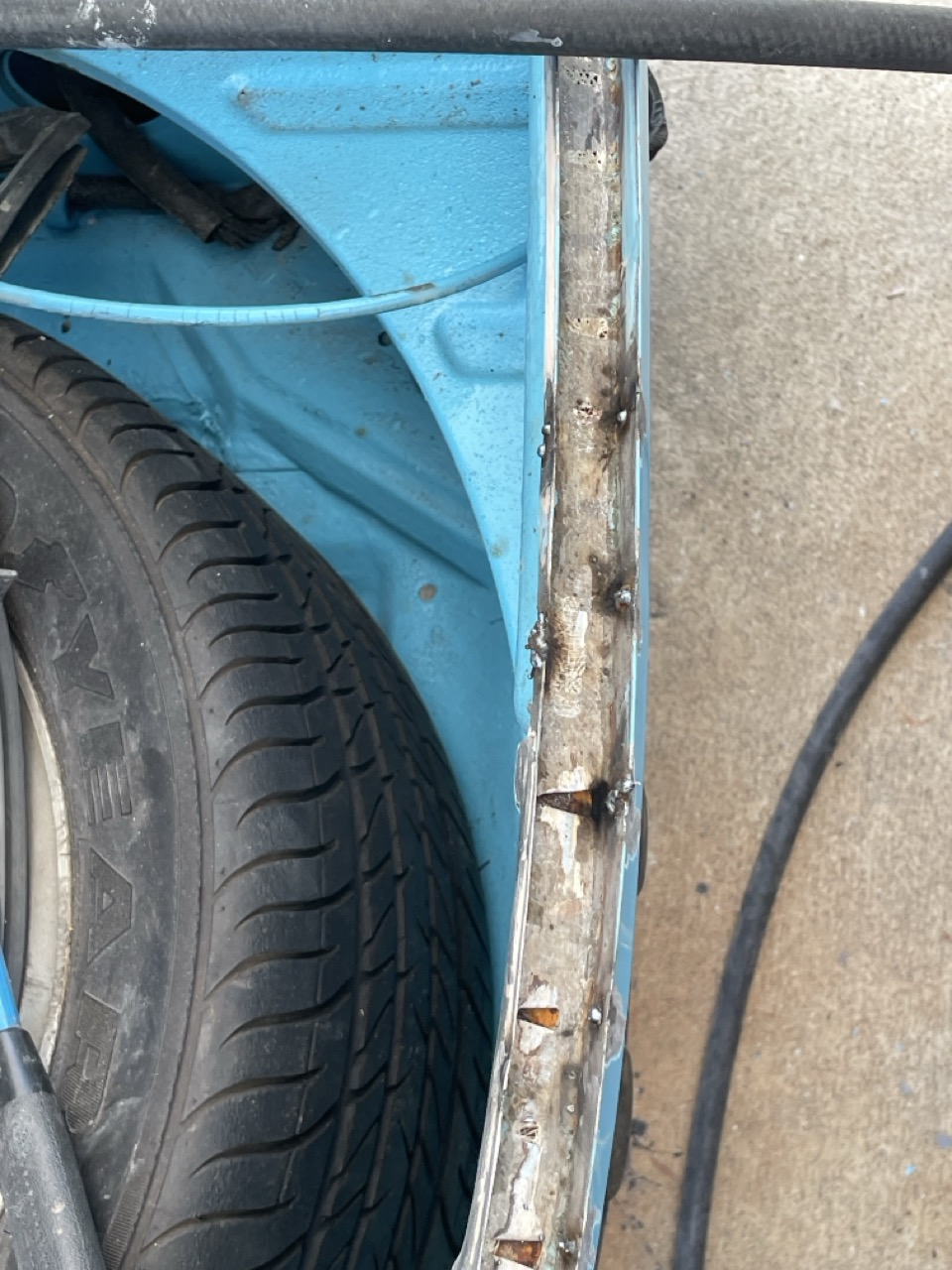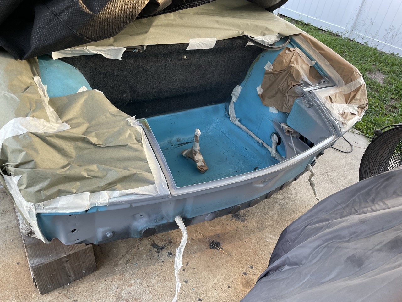 Finally got the front end buttoned up after finding shotty bondo caked rusted metal under it. Must have had a minor fender bender in the past and it wasn’t fixed correctly. Cleaned it out and welded it up. Later down the road if I decide to do a full paint restoration, I’ll do a perfect job and replace the spare tire holder area that has a not so good patch in it as well. But for now it will do the job and is protected from future rust. Just laid the paint down and now I can get back to what I was doing in the first place….putting driving lights behind the new 914 rubber grilles.
