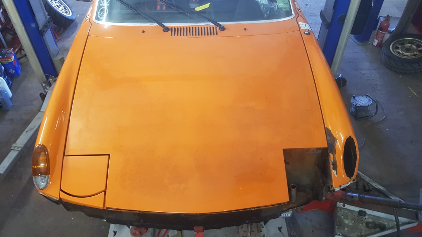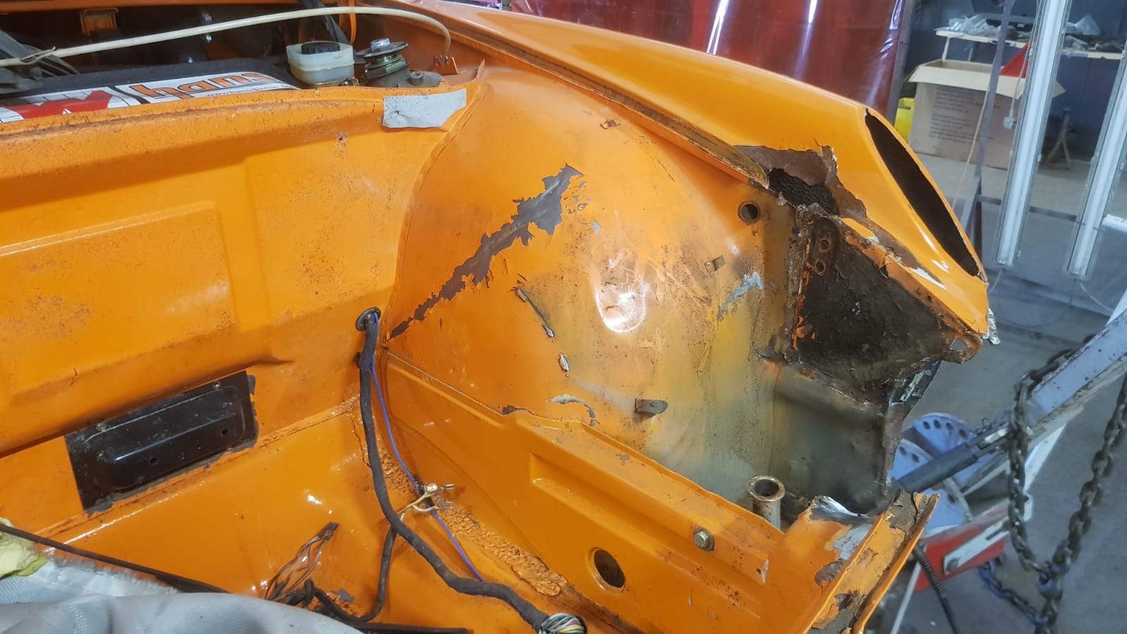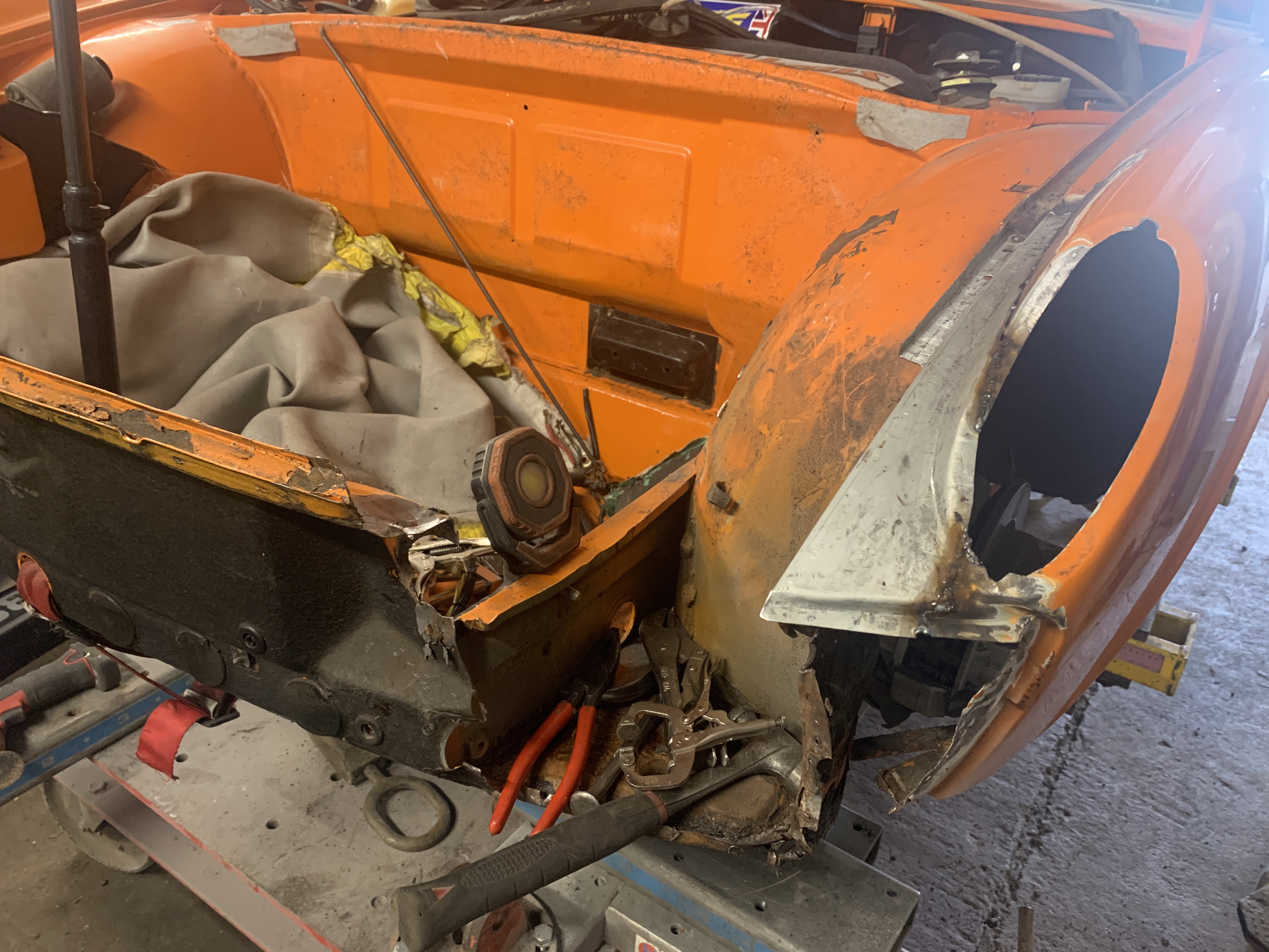 Ouch ,appeared to be a fairly big hit ,that would explain the bent front closing panel ,looks like you are in the hands to sort this ,cheers. Fortunately I am - Steve Kerti is one of the UK's top two or three Porsche restorers and a long time friend. Work continues - the front end is now pulled into shape. Aside from the 35mm vertical misalignment, the whole front end had also been shifted over by 25mm! Temporarily fitting the original steel hood confirmed all was good. (the seemingly wide gaps either side of the hood are amplified by shadows). Work now begins on cutting out the rust we discovered alongside the turn signal - Steve made the repair panel from a flat piece of steel. Just wish I had his skills... |