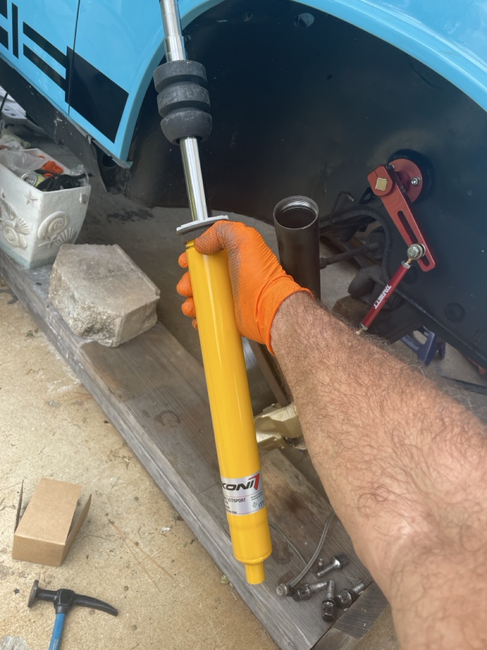 Spent the last two days adding a front sway bar and putting a new set of Koni Sports up front. The car didn’t have a front sway bar in it and the struts were shot, they would take a couple mins to fully rebound…lol.