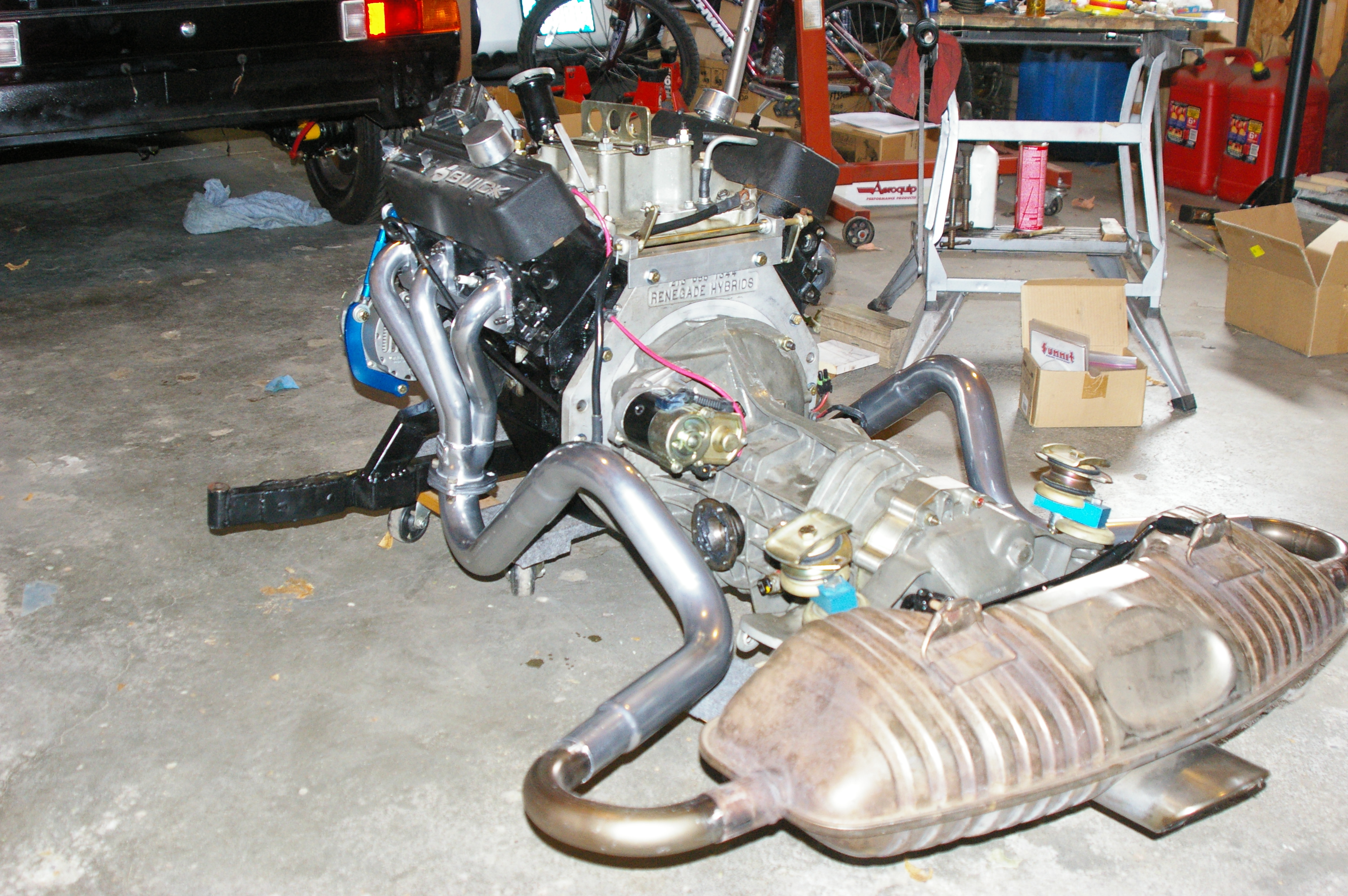 Looks good! Is that a Boxster muffler, and is there enough clearance between the transaxle and valance? Maybe with the V-6 is the engine mounts farther forward than the original?