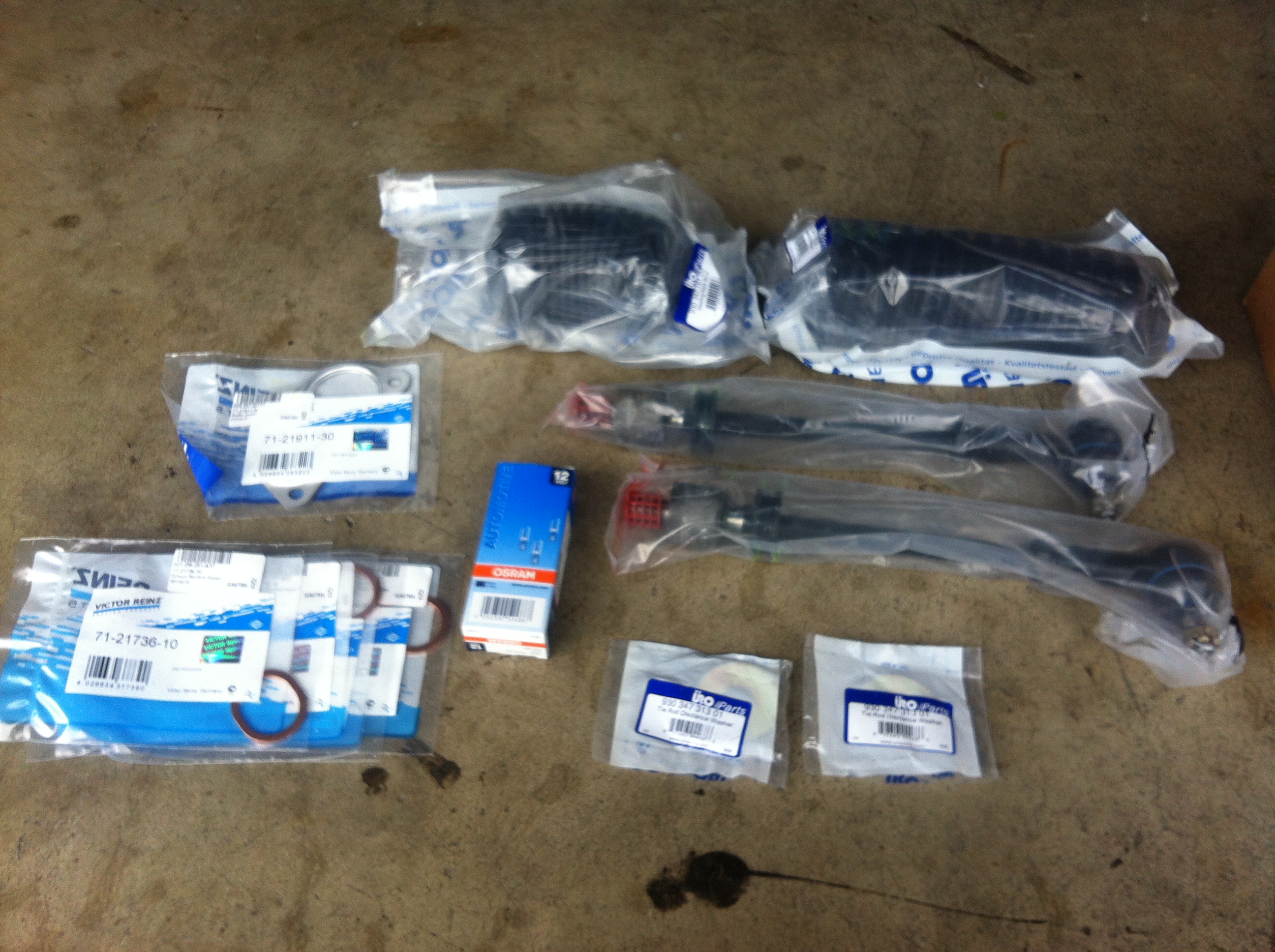 Installed gold PORSCHE letters on my engine grill. Fedex and USPS delivered my ordered turbo tie rod, various exhaust and muffler seal/gasket and some few bulbs. |