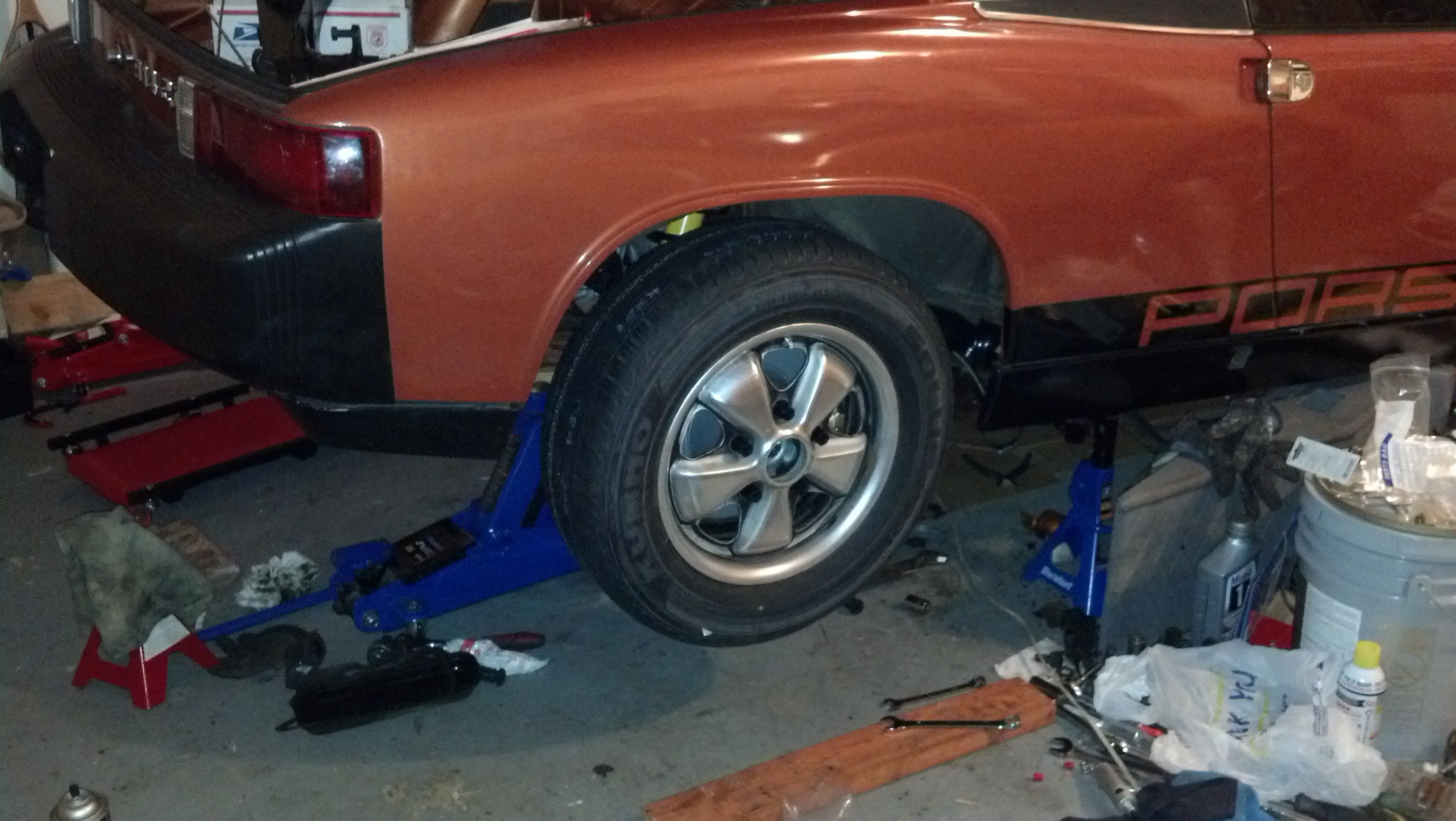 - but replaced all the hard lines from both sides, - put in new push rod tubes and seals on driver's side, both sides are now done!! - installed new brake line clips, - picked up my wheels- new tires mounted to my fuchs that are going the 5 lug conversion - but- my lugs seem to be 1-2mm too long to really tighten down my rims good, so i guess i bought the wrong lug nuts-they are like caps, maybe not quite deep enough? -kind of a bummer they are really nice alloy porsche lug cap/nuts! , so one setback , but hoping to mount the left side suspension and the set the valves this weekend, finish the left side mounting of the brake calipers, bleed rear brakes, set rear brake venting - then drive a bit , put her back up to do the front!! |