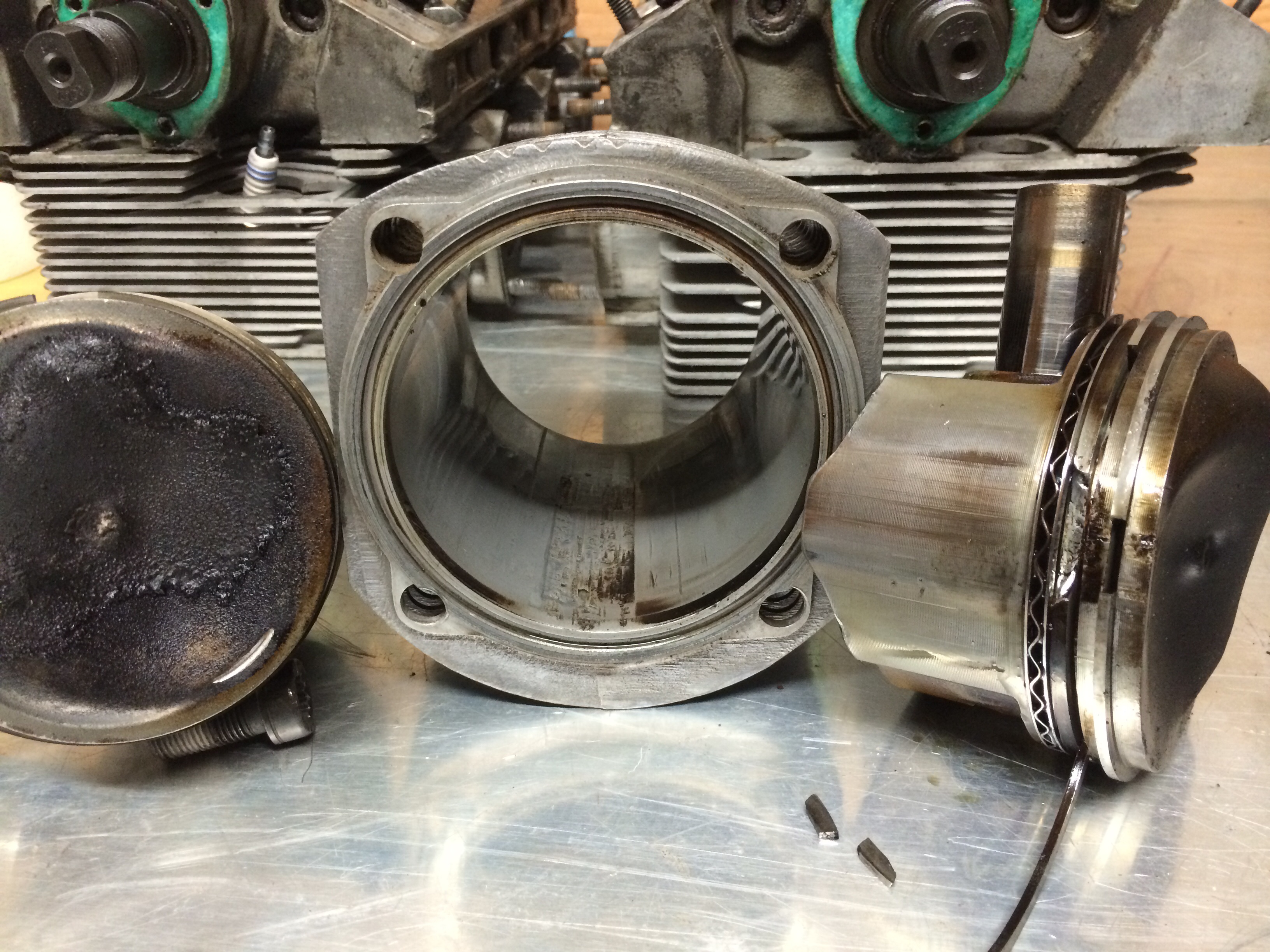 Got the other side taken apart today, seems all the pistons on this side were hitting the exhaust valves, no visible damage to the heads, but all three had small marks in the piston tops, also #6 has a broken ring, a chunk of piston missing and quite the gouge in the cylinder wall. Guess that's why it broke down at Parade. (IMG:style_emoticons/default/blowup.gif)