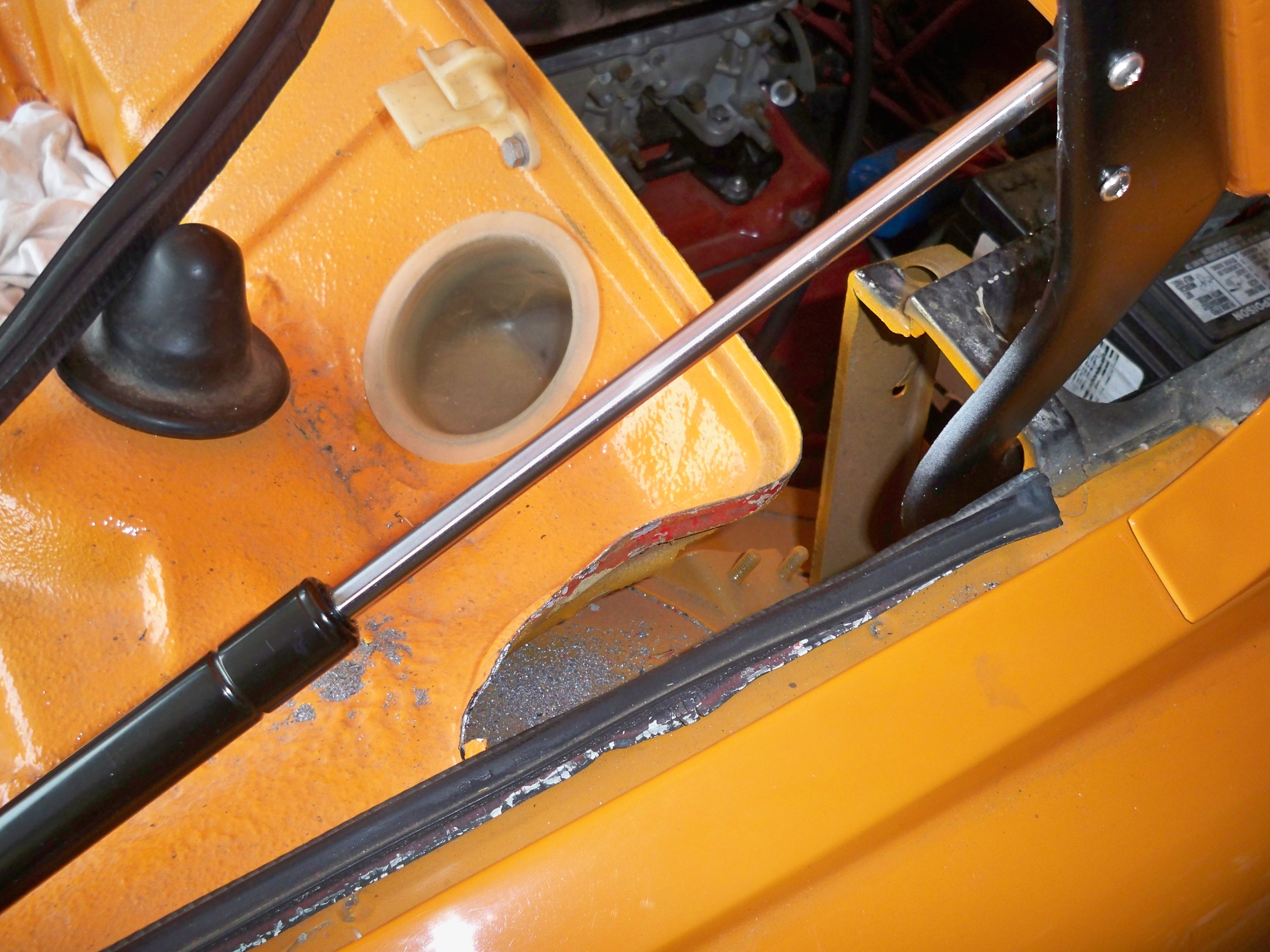 The instructions say to cut out a small area of the sheet metal which you can see. I also had to bend some of the sheet metal in toward the trunk to clear the top of the strut. BTW the struts are great, the price is right, don't waste your time trying to put a kit together on your own, the instructions are clear (for us stupid taxpayers), but the pictures in the instructions...ahhh, not so much. Take a last look at the photos on the Camp 914 website before you start and things will go well. |