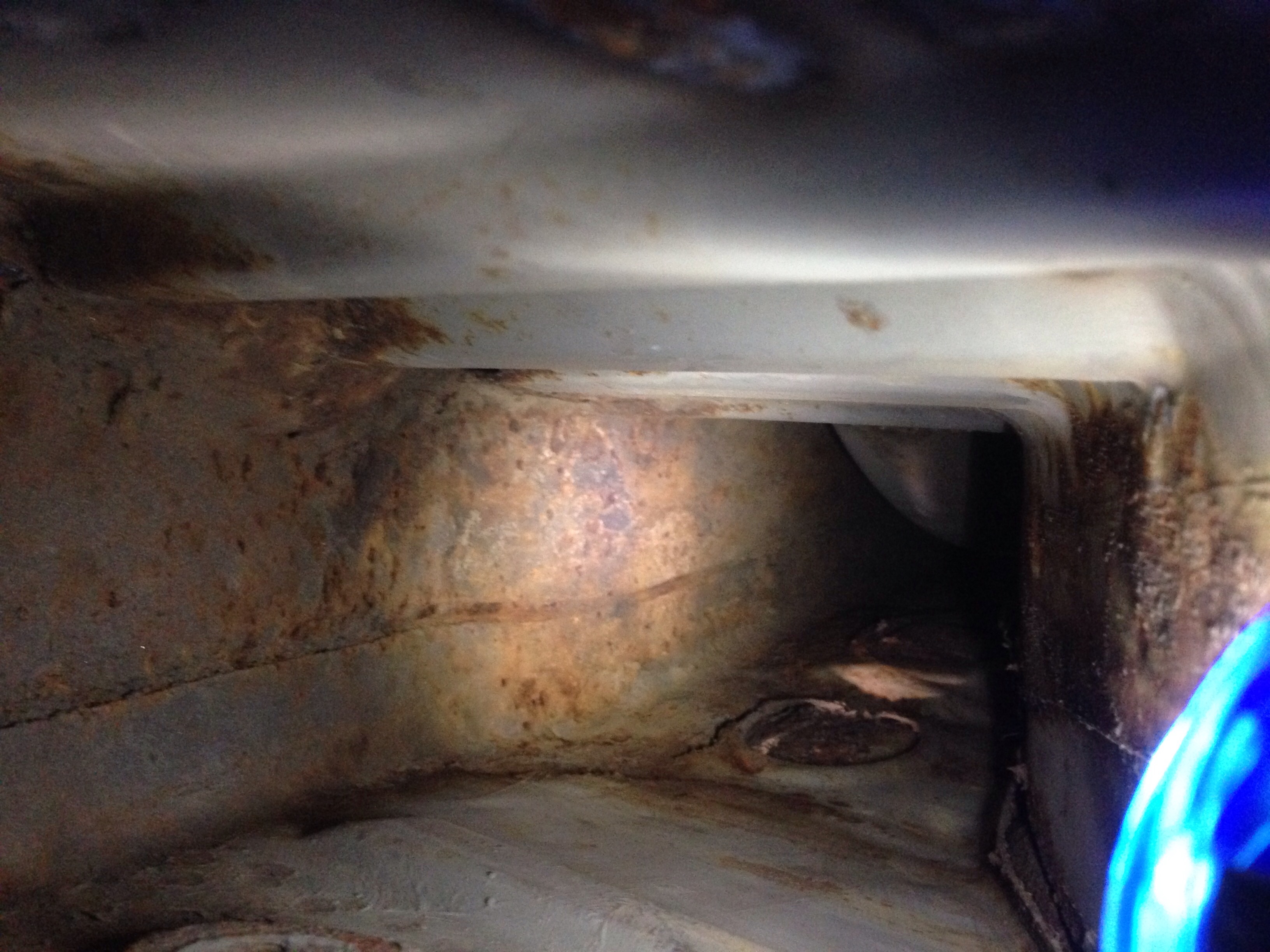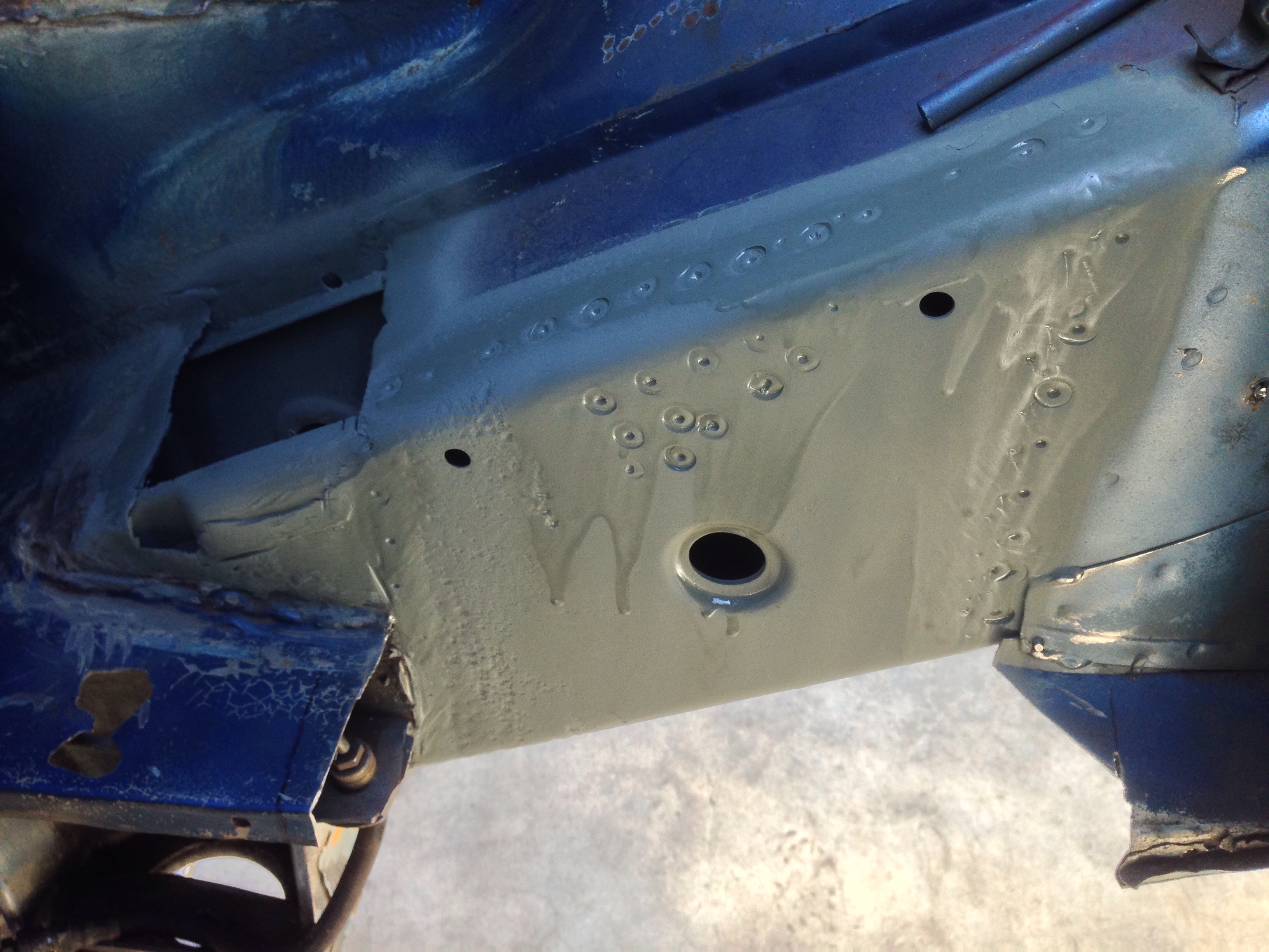 This morning I was able to do some prep work for my 71 1.7 rear suspension console installation and I cut a piece of metal for repair and was able to take a picture of the inside just below the "hell hole". Atleast not that bad looking! You might think about spraying some of Eastwood's 'Rust Encapsulator' in that long before you button it up (IMG:style_emoticons/default/idea.gif) ... and in the driver side too (IMG:style_emoticons/default/confused24.gif) |