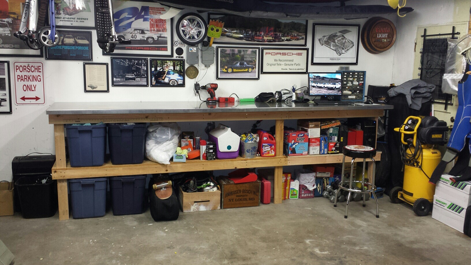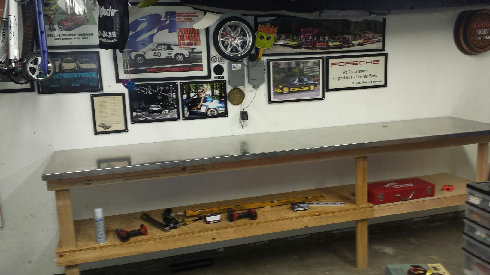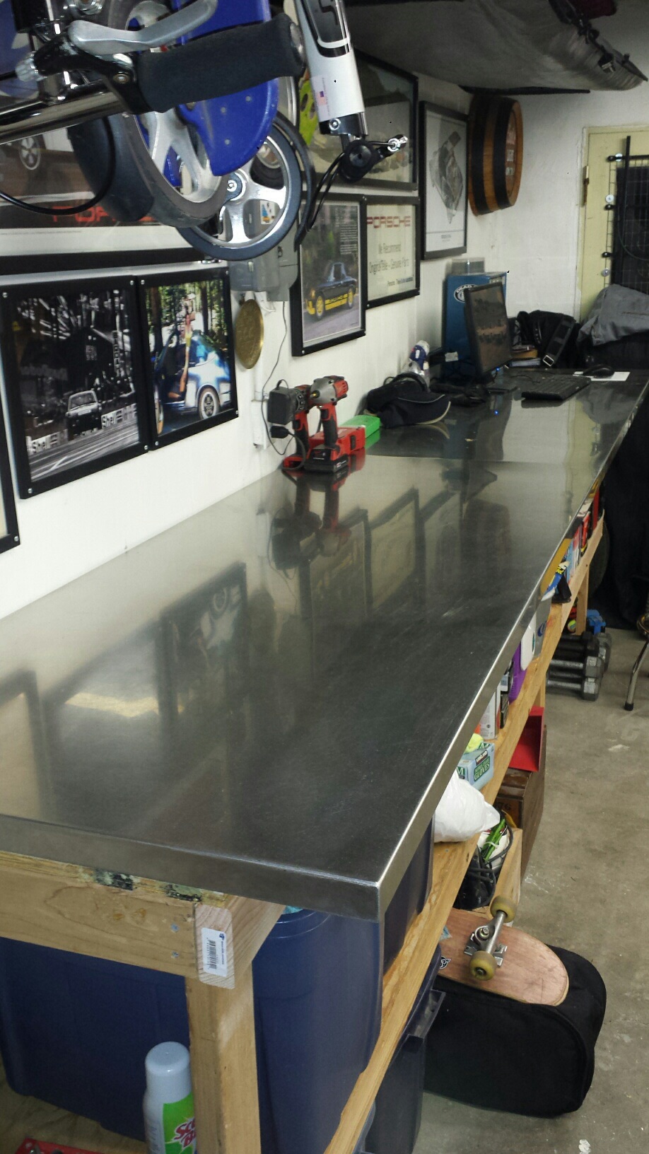 Backed both 914's out of the garage to redo my work bench. I scored a stainless steel bench top that is 12' long. I had to extend my bench from 8' to 12' as the top has nice finished edges and I couldn't cut it down to leave one edge raw. I think this top will last longer than the house. I did drive the 914's several miles each to get them warmed up and moving.