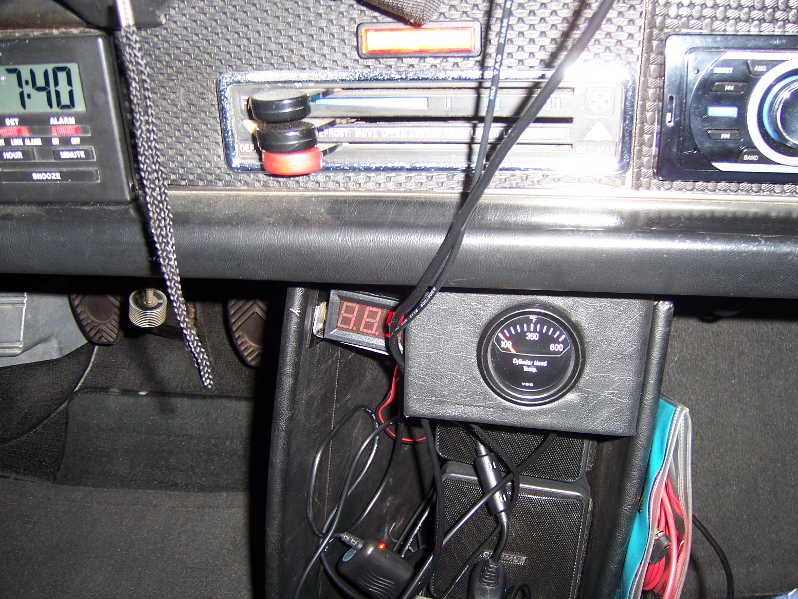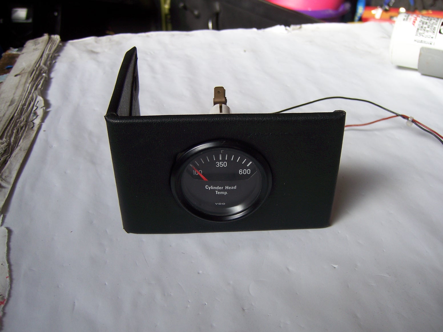 fabricated a halon extinguisher mount out of plastic pipe and aluminum bar stock and installed the #3 spark plug VDO head temperature kit. I also fabbed up my own VDO bracket out of aluminum and covered it in vintage sheet vinyl from a 914 seat. I know the VDO CHT has a bad reputation for being inaccurate, but it provides some information.