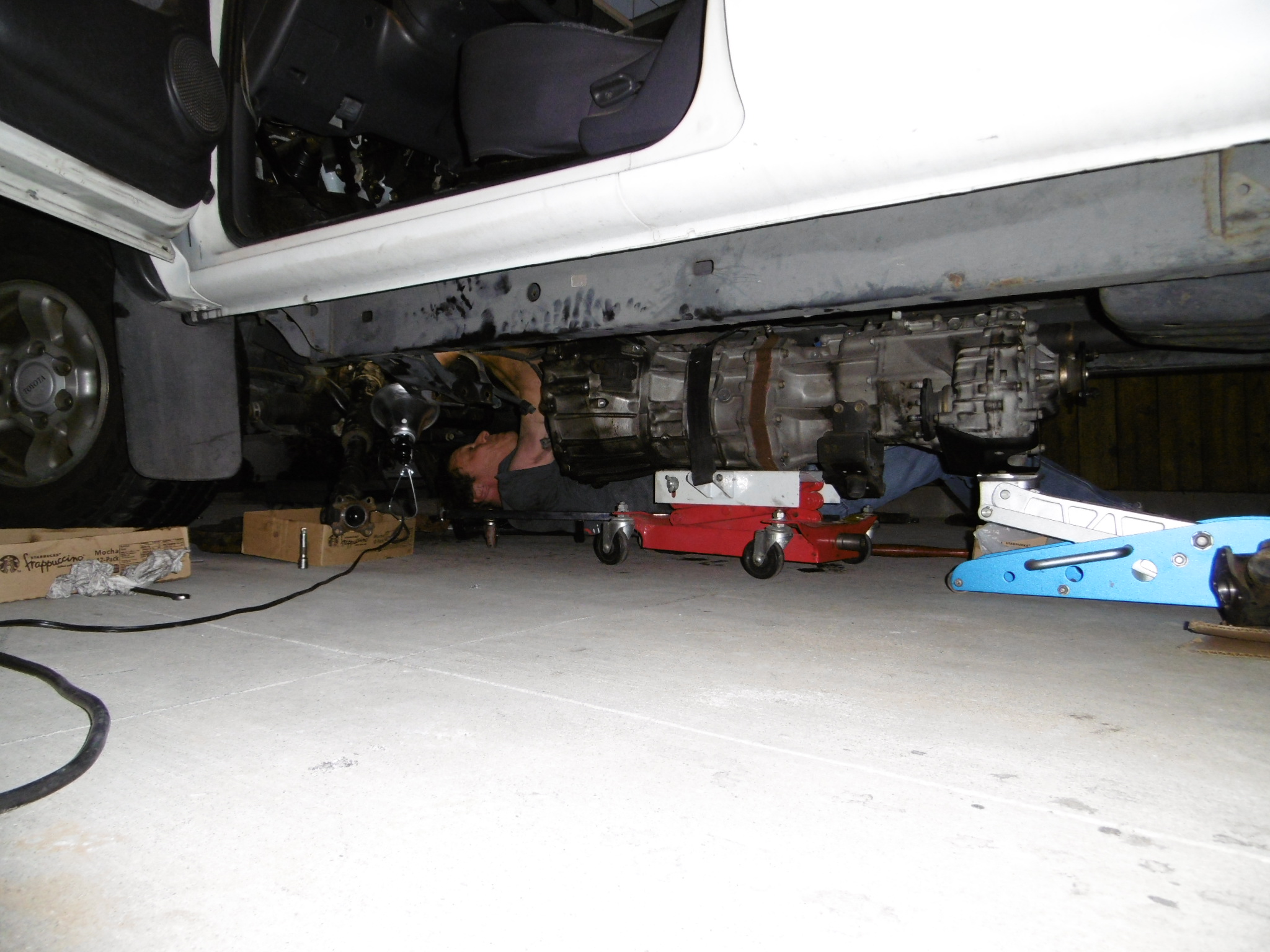 Didn't get the ignition switch replaced in the 'BB' today as planned, but my friend Fred came by and we DID get the trans out of the Tacoma 'parts hauler' (IMG:style_emoticons/default/aktion035.gif)
