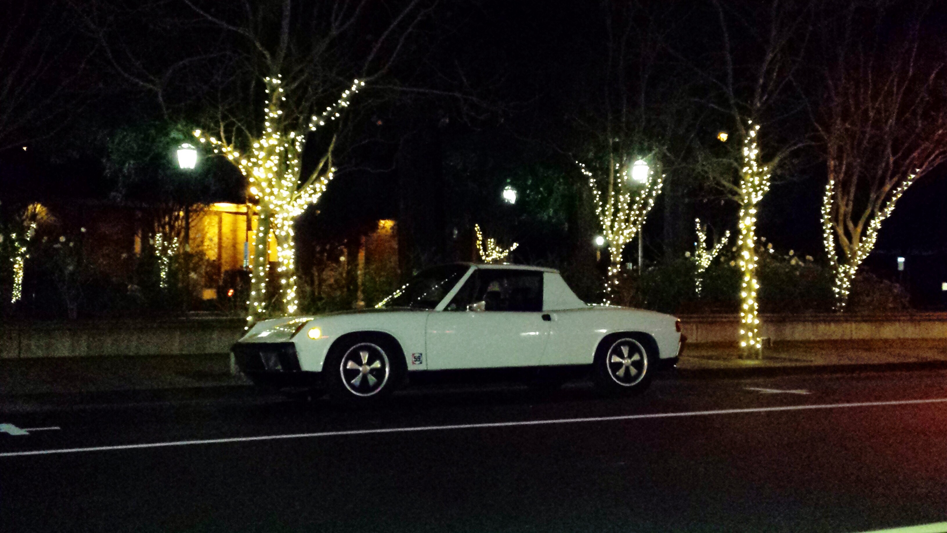 Michael - That steering wheel looks terrific. Thanks Michael, BeatNavy and Lonewolfe for the compliments on the wheel. I got a good chance to test it out on my drive to Santa Cruz today. I went to Steamers Lane to check out the surf. When I parked on the cliff I was immediately passed by a teal or grey colored 914. I think it had a 916 style bumper. I came home on old Santa Cruz Highway to beat the weekend crowds on HWY 17. Stopped in Los Gatos for dinner and took the photo with the lights on the trees downtown. |