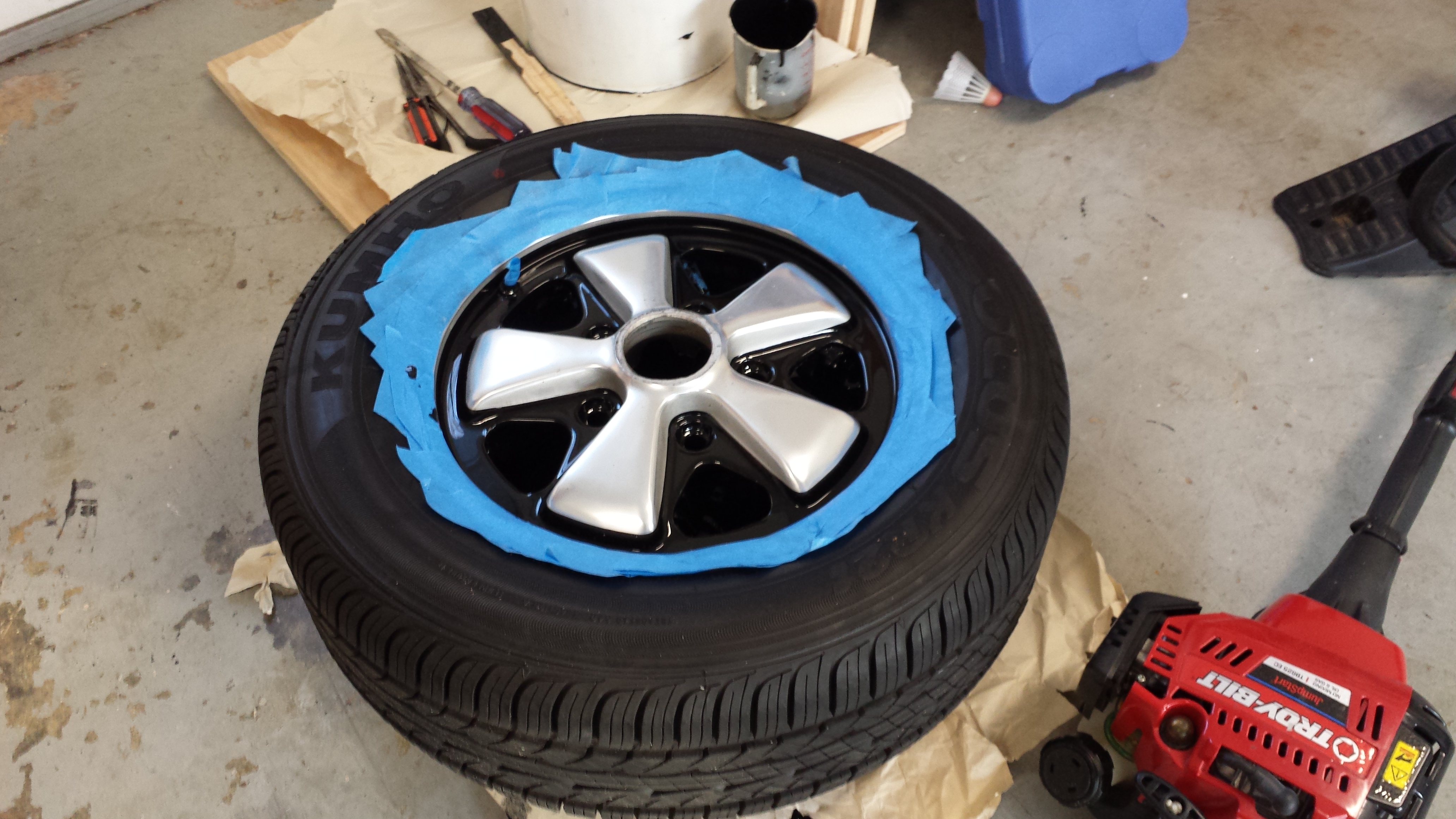 Last one took forever to cure and harden so this one i thinned just a little and I added a curing agent, japan dryer. 2 down and 3 to go. I taped off the back holes, leveled the wheel over a basin and poured the paint in until it was up to the level of the original paint line. I will post more pictures after its dry . Attached thumbnail(s) |
