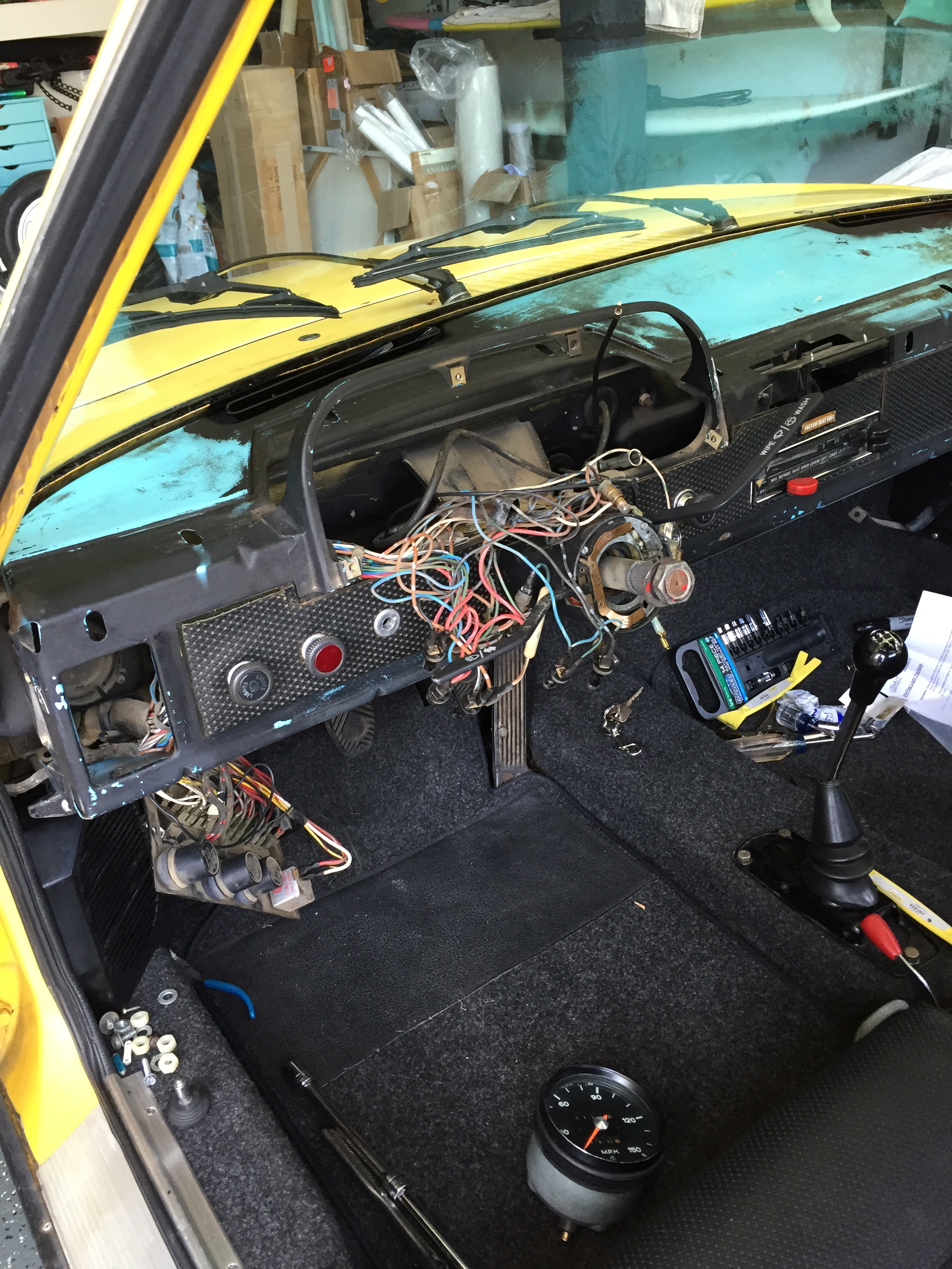I tore into my dash all weekend and got a lot of stuff done. I wanted to do the dash top with 914 Rubber vinyl, put a new powder coated gauge panel in, fix a few issues, and…. I installed the JWest foglight kit, which was actually simple. Foglight switch lights up and fogs work now. The way to do the wiring is with a good full color schematic and take tons of pictures of the backs of the gauges before you start pulling wires off.
