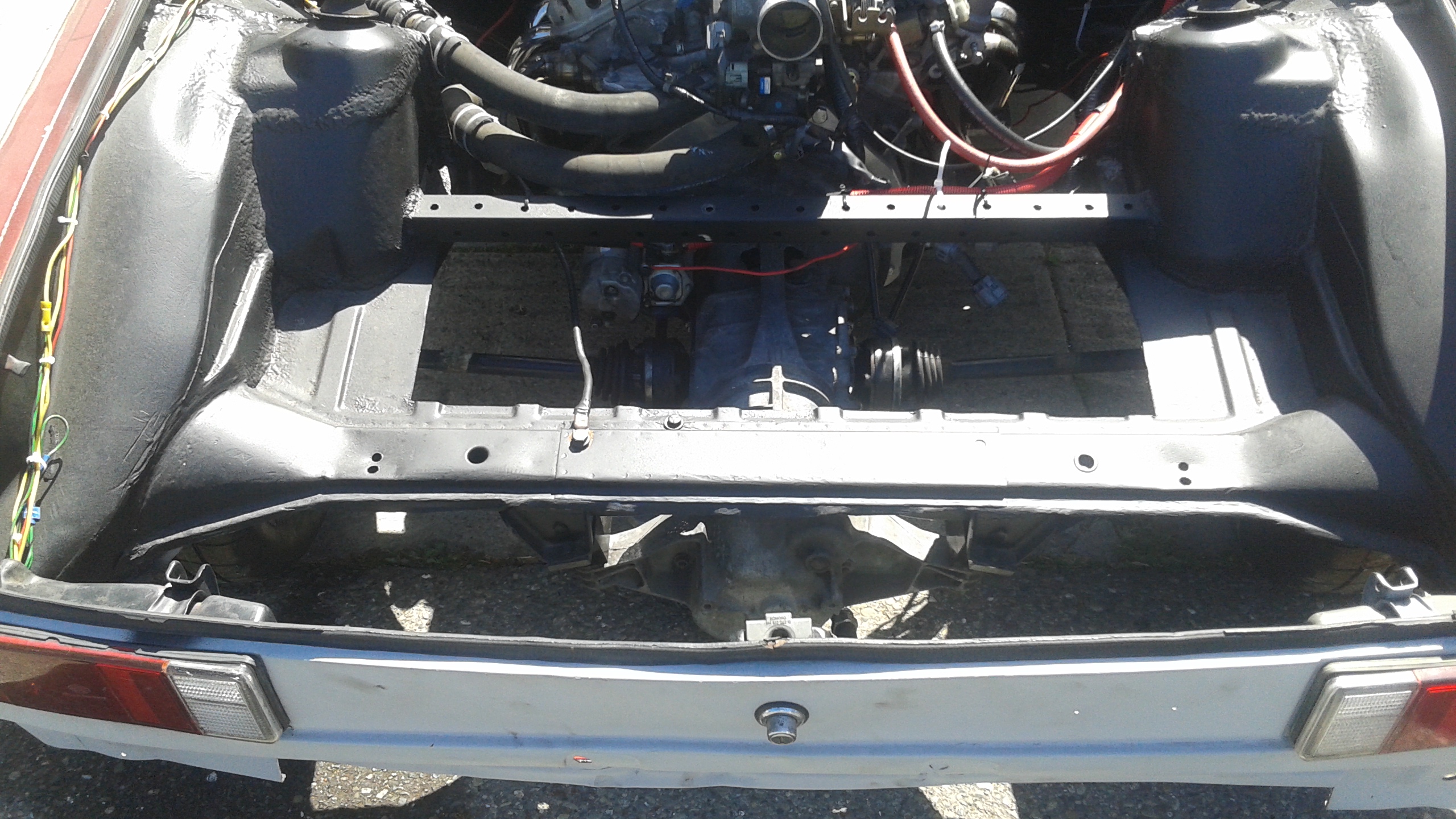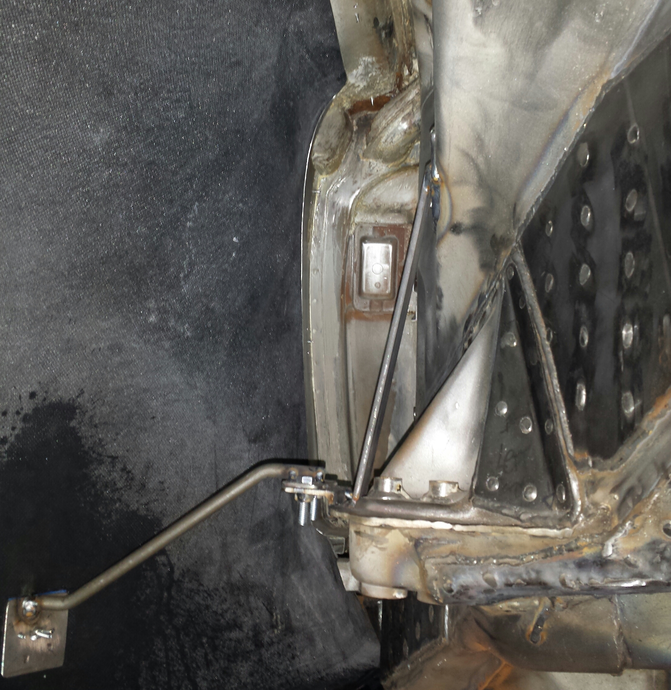 I moved the engine latch pull: (IMG:http://www.914world.com/bbs2/uploads_offsite/i366.photobucket.com-10819-1436672435.1.jpg) (IMG:http://www.914world.com/bbs2/uploads_offsite/i366.photobucket.com-10819-1436672435.2.jpg) I mainly did that because with the rollcage, you had to open the door and reach under to pull the lid latch. And put rear trailing arm drop limiters on: (IMG:http://www.914world.com/bbs2/uploads_offsite/i366.photobucket.com-10819-1436672435.3.jpg) These make it so that when you jack up the car, the trailing arms dont droop so far you strain the CVs and my springs dont come out of the perches. If I did that again I'd use an old seatbelt and a couple of belt brackets. |