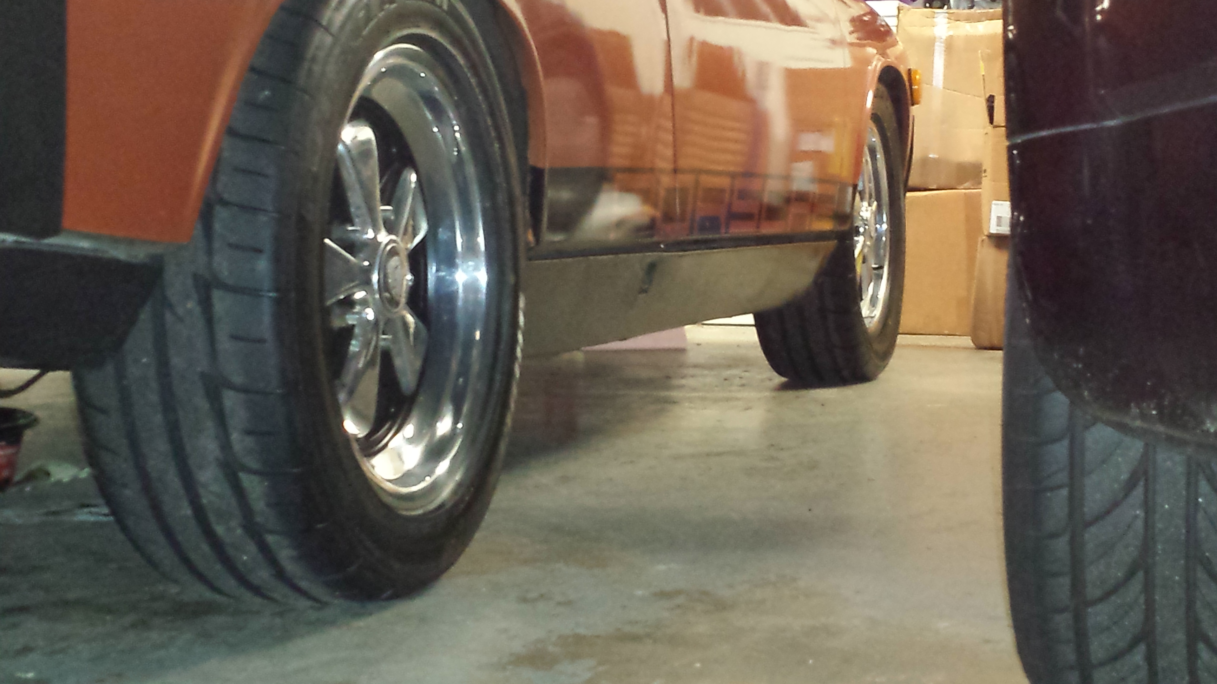 2. Pulled wheels, shocks, reset spring height on the rears to get better clearance for the new 7" fuchs, also resulting in a better balance from back to front. Tried the longer 90# springs but ended up staying with the 100# weltmeisters. 3. Drove to FroYo with my youngest and met the wife and other daughter for a treat! Best night in 2 months. Only 40% humidity ttoday and 85!, has been 95+ for over a month. 4. Lost the dash lights, and headlights won't go down, not sure why yet. Attached thumbnail(s) |