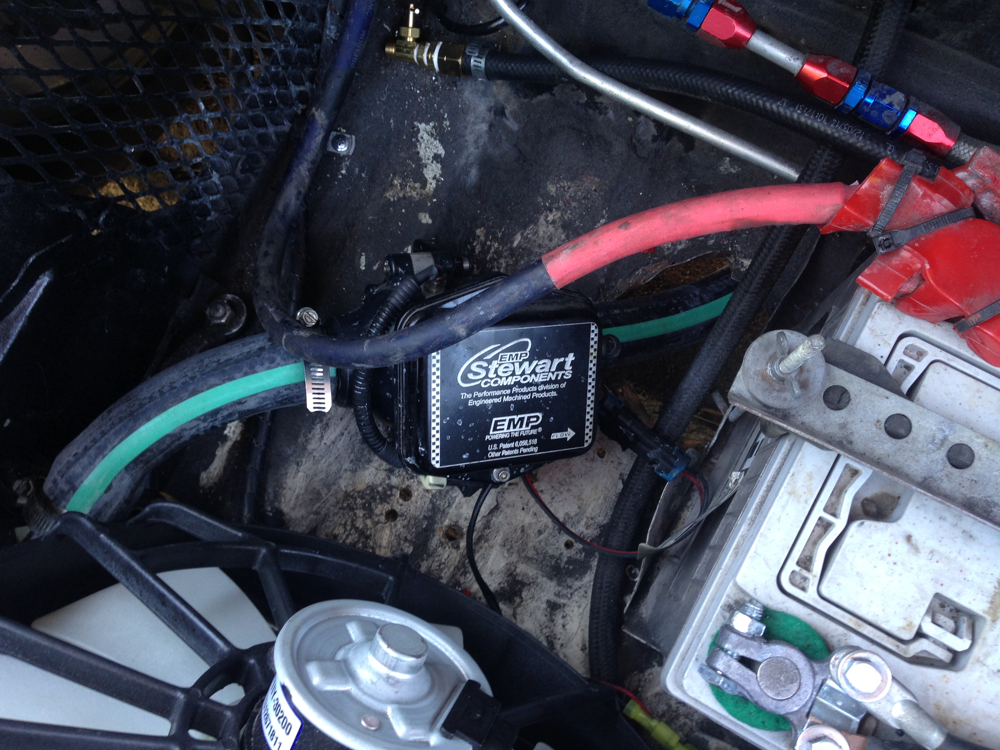 I replaced my cooling lines with new green stripe hose. I also moved my water pump so it will pull from the radiator and push to the engine. This seemed to reduce cavitation during testing. Should be driving again tomorrow. Mike, that makes sense to me also. It's gotta beat the hell out of the little Subie water pump flailing away trying to pull that water column over what, like 6 ft or so of tubing? Anything to keep the coolant stream moving and put less strain on other pieces never designed to do the work has to help. What type of testing were you doing for these results? And when do we see MORE PICTURES??!! Sorry... I'm bored of hospitals and rehab with almost a month left to go... (IMG:style_emoticons/default/sad.gif) haven't even SEEN my car since June 5th. (IMG:style_emoticons/default/mad.gif) My testing has been mostly by ear. The pump motor is almost silent so when running I can hear air cavitation in the line. With the pump on the outlet of the radiator, I hear no cavitation. The engine is running slightly cooler on the same radiator as well. I took it on a 20 mile journey today and the temps never got above 190°. An added advantage is this setup for whatever reason is easier to burp, pushing air to the high spot in-line filler. |