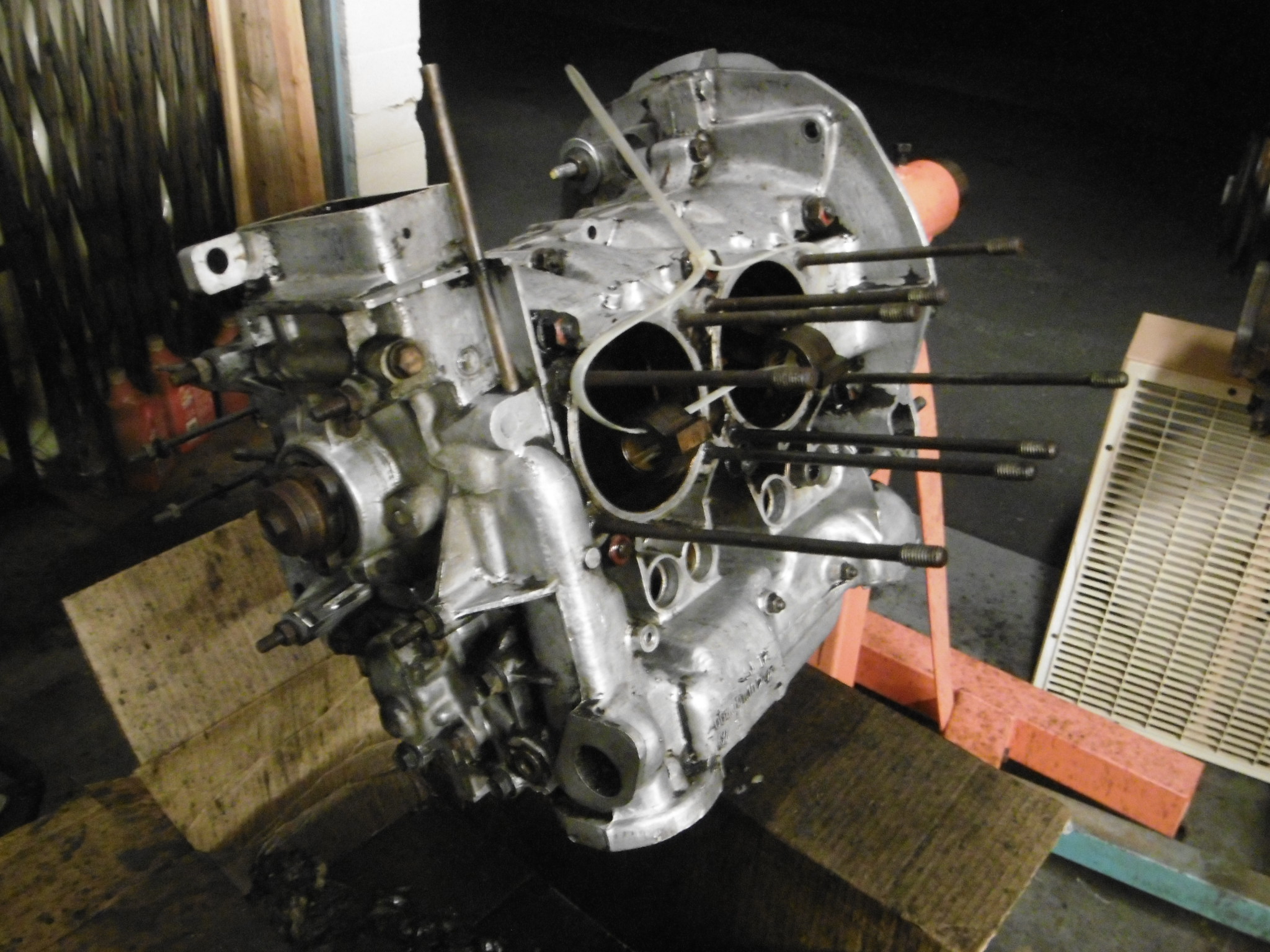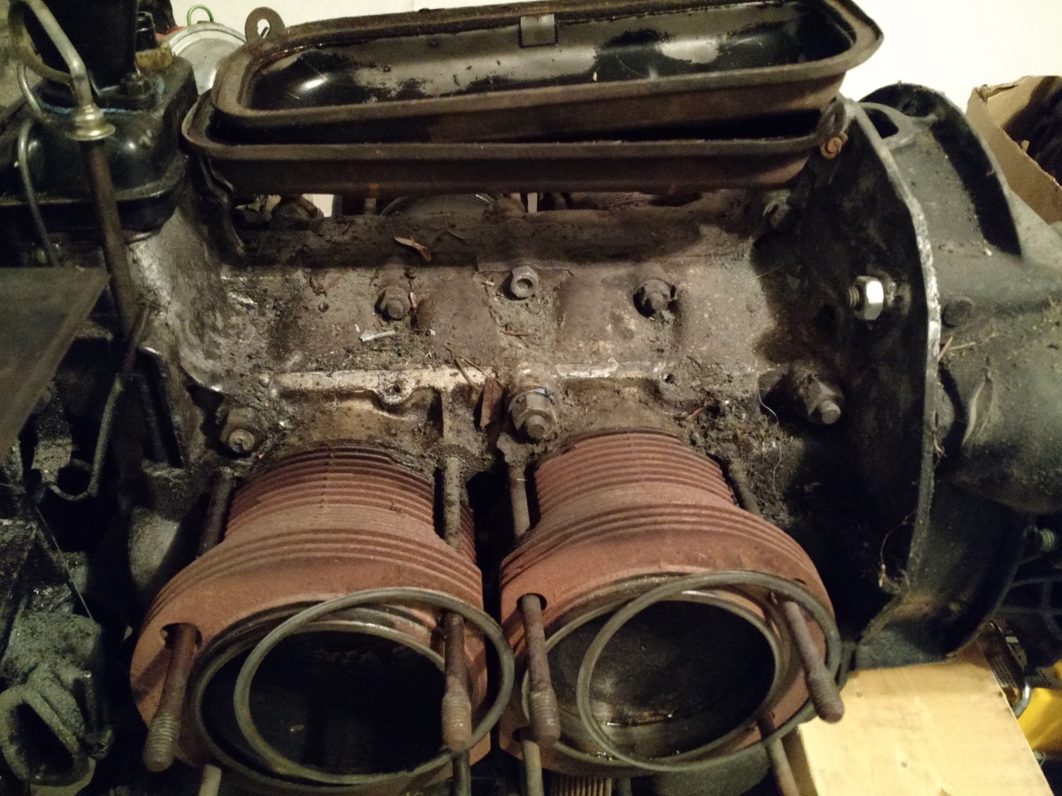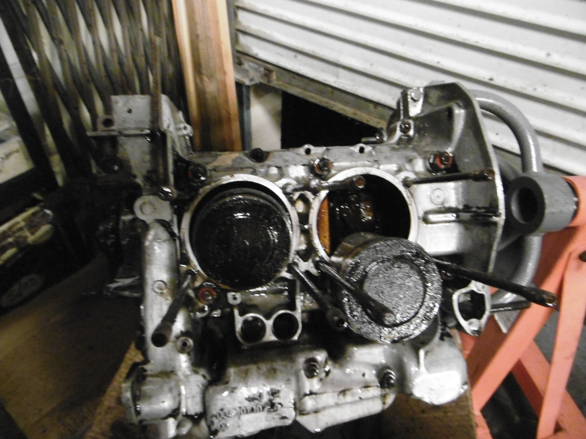 How did you degrease the engine without getting junk inside? Just spray and wipe with a rag? I have the same job to do, but no experience yet! Bryan, I rotated the motor with the pistons pointed down on the side I was cleaning at the time. Placed a large cardboard box underneath, sprayed small areas and used a plastic putty knife and paper towels.Doesn't matter too much if stuff gets inside though, it's all coming apart anyway. Just wanted it to be fairly clean before splitting the case. |