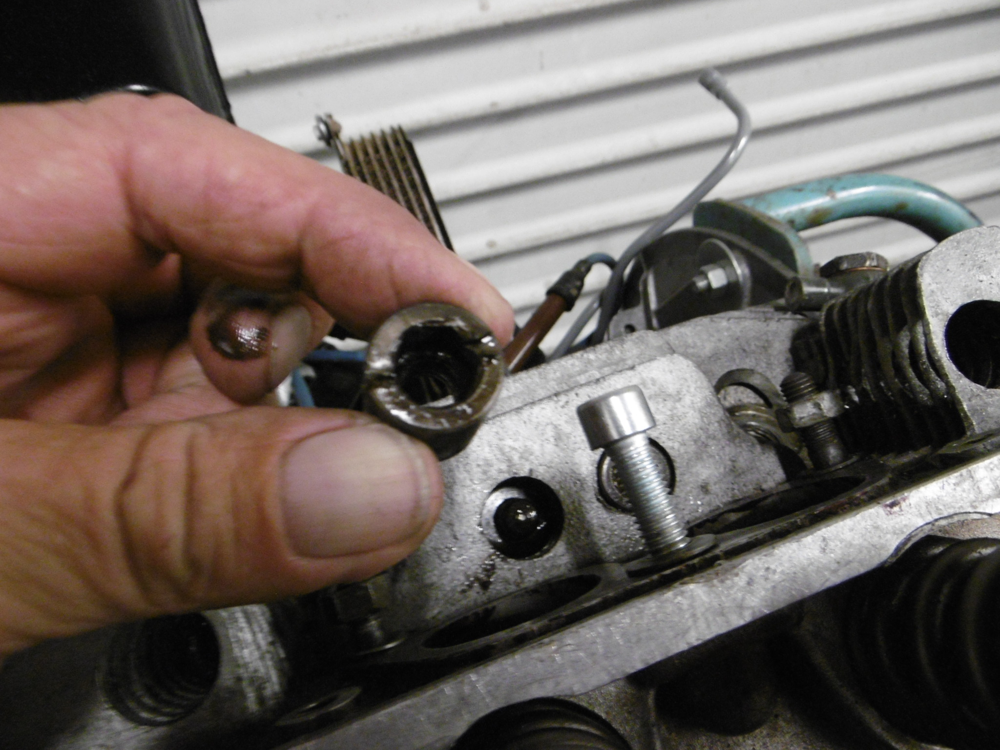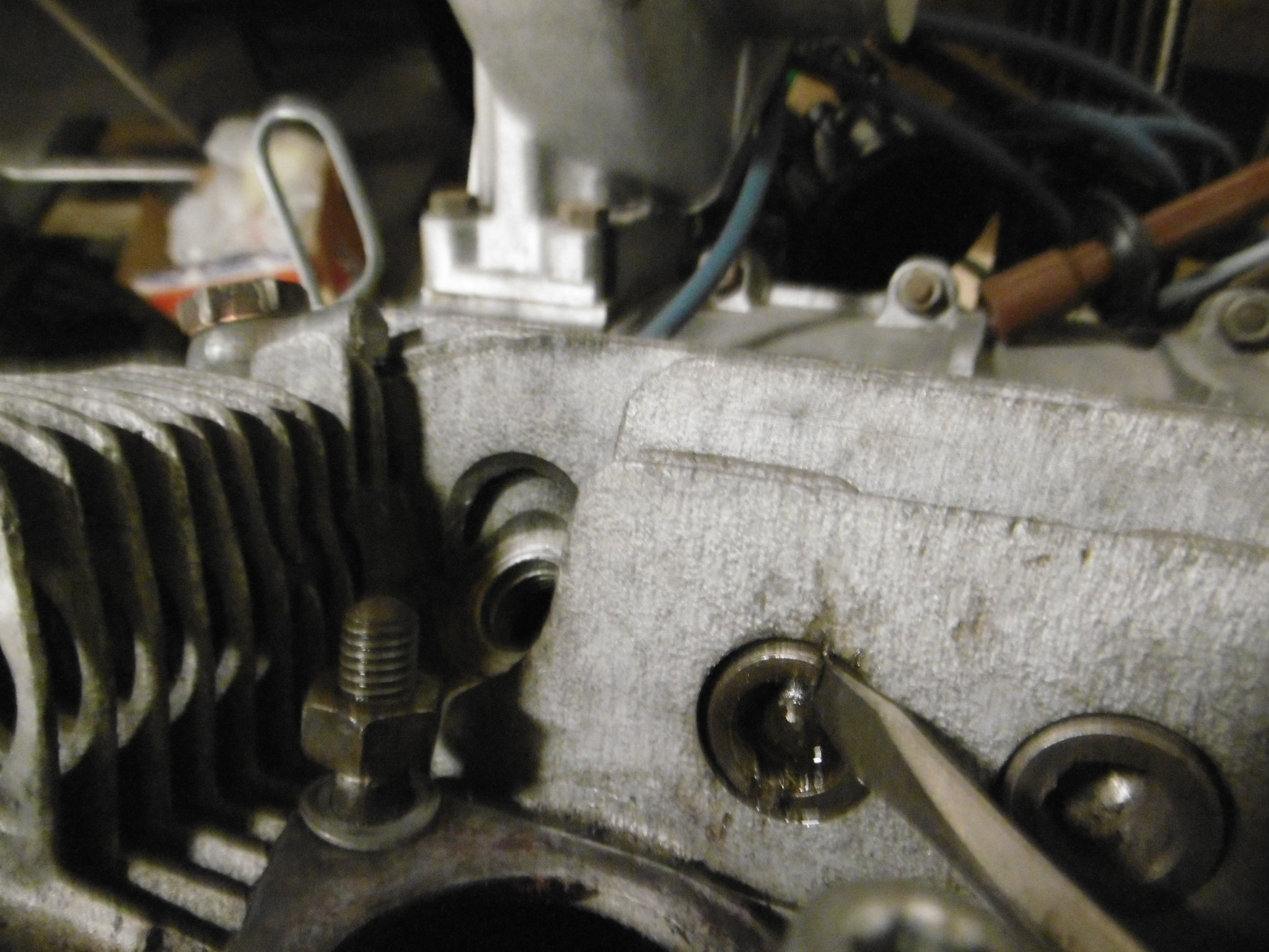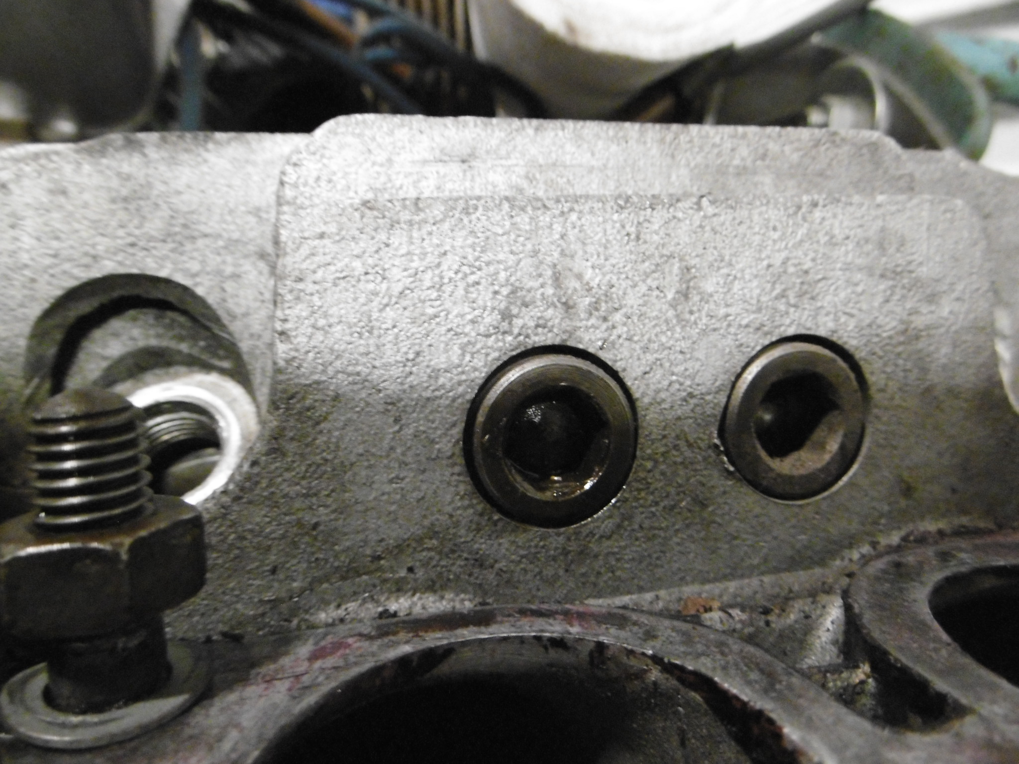 De-greased a little more on my wife's 1.7L, the 1~2 side. I like motors to be somewhat clean before I take 'em apart and as you can see, this motor was definitely GREASY! This is where I left off. Still have the front end and bottom to clean up. Then went back to work on the 912 motor. Greased the valve cover gasket and buttoned up the 1~2 side ... Then I moved over to the 3~4 side and started to remove the intake manifold. The nuts were easy, but it felt like the middle bolt was going to break off, so I saturated the shank with PB and let it sit for a while. Finally got it out and the threads looked galled. Chased the threaded holes in both heads and will buy new bolts for both sides. Removed the rocker arm assembly and push rods - no issues, except there were (7) wave washers missing, just like the other side (IMG:style_emoticons/default/mad.gif) I started to remove the head nuts and ran into another problem. The Allen socket bit won't catch two of the top-side nuts. How the PO got them on this far is anyone's guess. They are screwed down so far the ends of the studs are only a 1/4" in. I'll bet the PO installed the wrong length studs when I get the heads off to check it all out (IMG:style_emoticons/default/screwy.gif) I guess I can try grinding the tip of the bit to square it off, but I doubt even that will do the trick. I may need to chisel them off (IMG:style_emoticons/default/confused24.gif) More in next post ... |