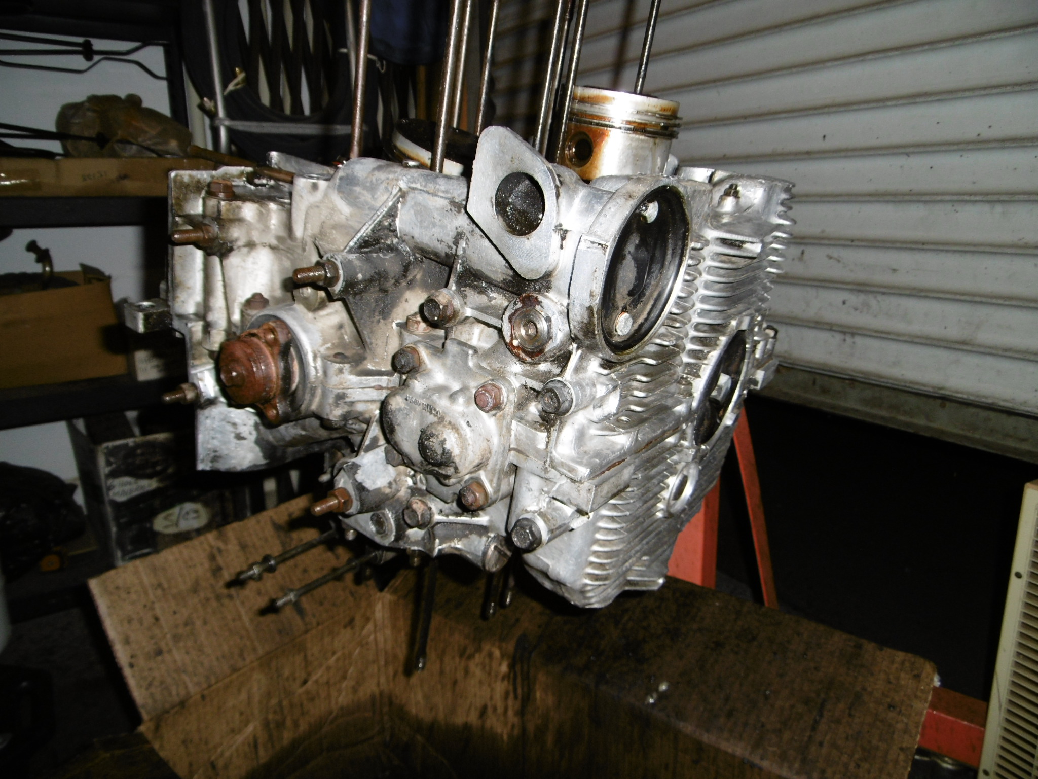 Bryan, I rotated the motor with the pistons pointed down on the side I was cleaning at the time. Placed a large cardboard box underneath, sprayed small areas and used a plastic putty knife and paper towels. Doesn't matter too much if stuff gets inside though, it's all coming apart anyway. Just wanted it to be fairly clean before splitting the case. That makes sense. I don't have a stand right now, but maybe I can pick one up shortly and clean it like you did. I wanted to pull the cylinders off and clean them up too, but wasn't planing to take anything else apart. (famous last words) |