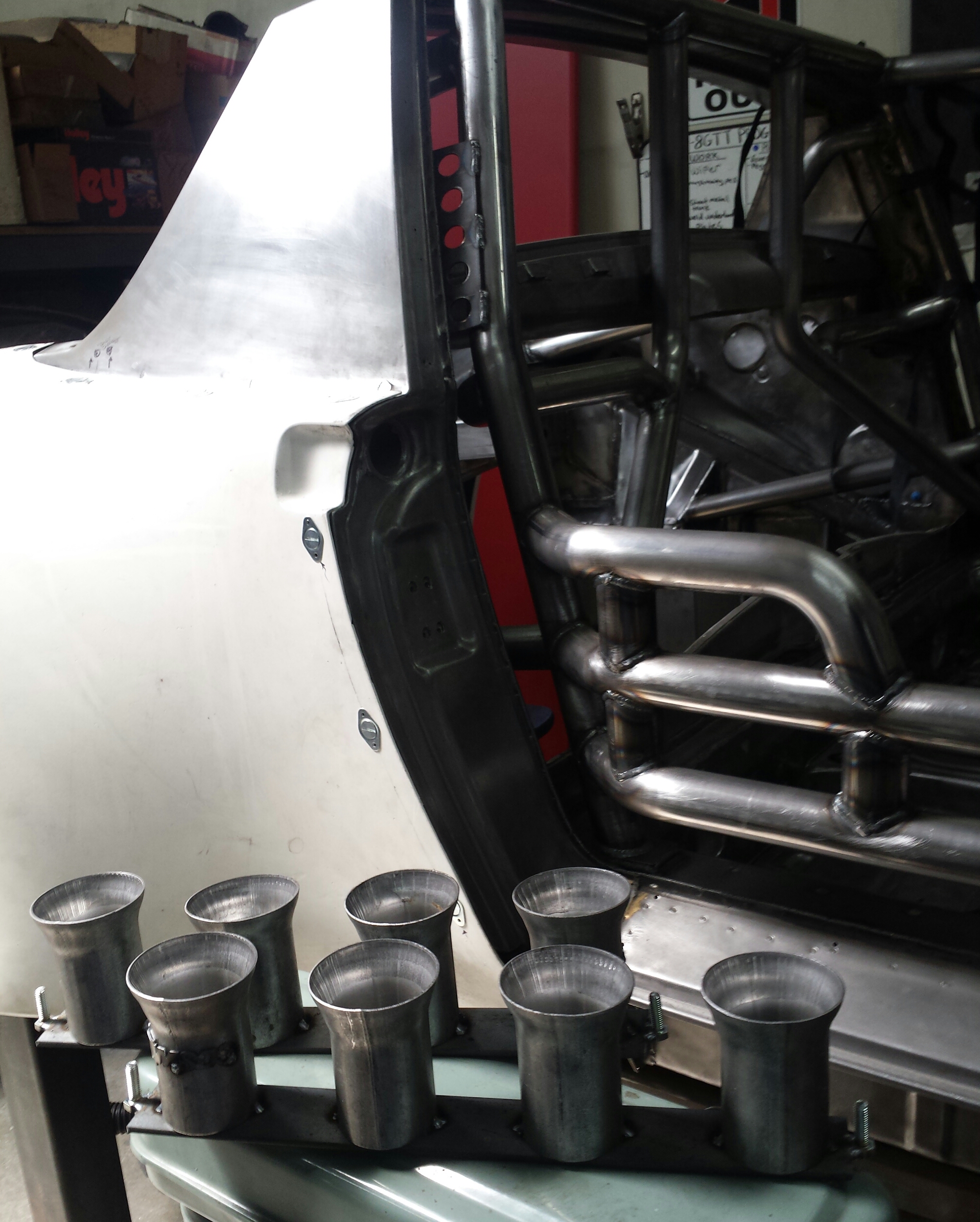 I took a 914 work break when I had a request from a member of "Street Outlaws" for another car they are building. It's for a Grand Marquis , similar to the Crown Vic. Special set of fakey Zoomie exhaust headers that will stick out of the hood.