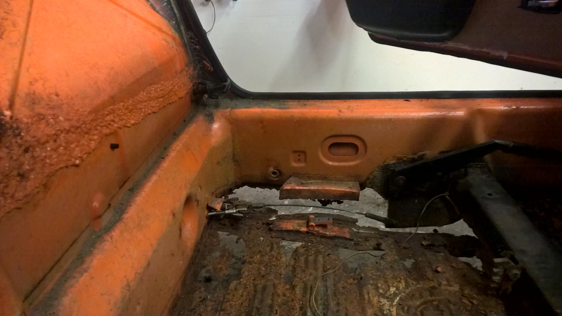 ... When I brought this car home a few months ago I was nearly able to pull the driver seat out, attached to the mounts, with my bare hands. Pretty much only the reinforcement strap and sound padding was holding it together - the entire back 50% of the floorpan was rust. ... Holy-Moly ... literally (IMG:style_emoticons/default/yikes.gif)Having not noticed this damage under the driver's seat when I bought it (sight unseen and without telling the wife) I drove it home 60 miles on mainly the freeway with expired tabs and no title. After I saw what was under the driver's seat that little adventure went from "amusing adventure" to "I literally could have died in numerous exciting ways". |
