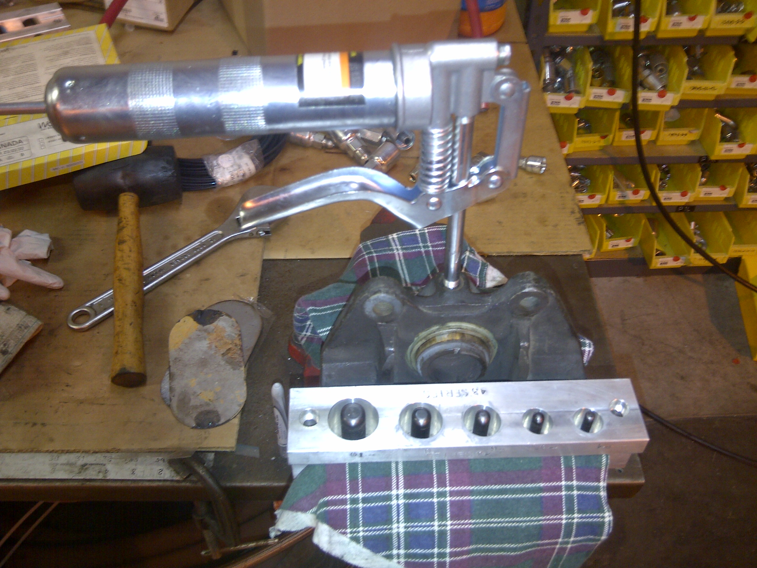 FINALLY got M caliper piston out after 100+ LBS of air pressure, heat and a BFH (IMG:style_emoticons/default/smash.gif) . Some one had used the grease gun previously without success and when the piston blew out there was grease everywhere. (IMG:style_emoticons/default/headbang.gif)